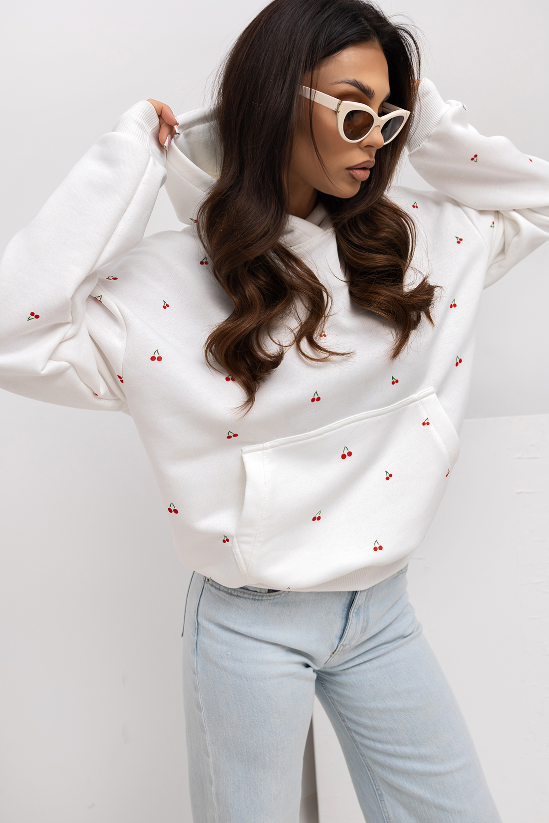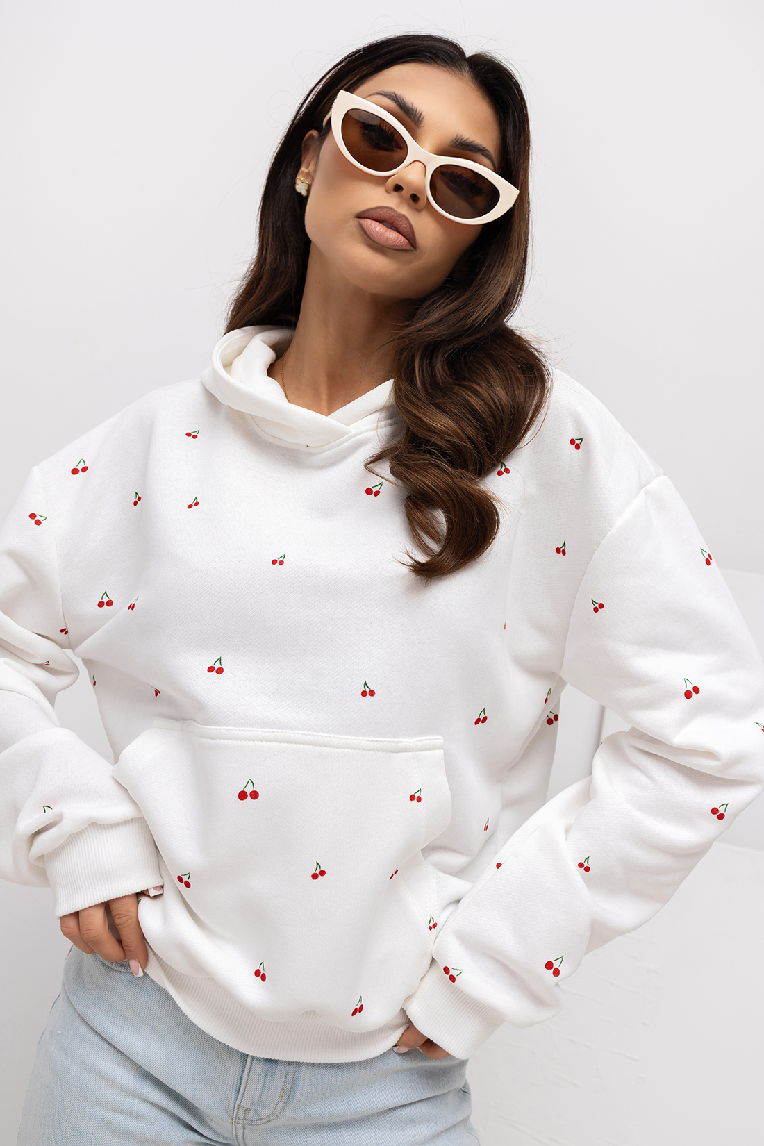 Bluza damska z kapturem Wisienki Lara Fashion biała