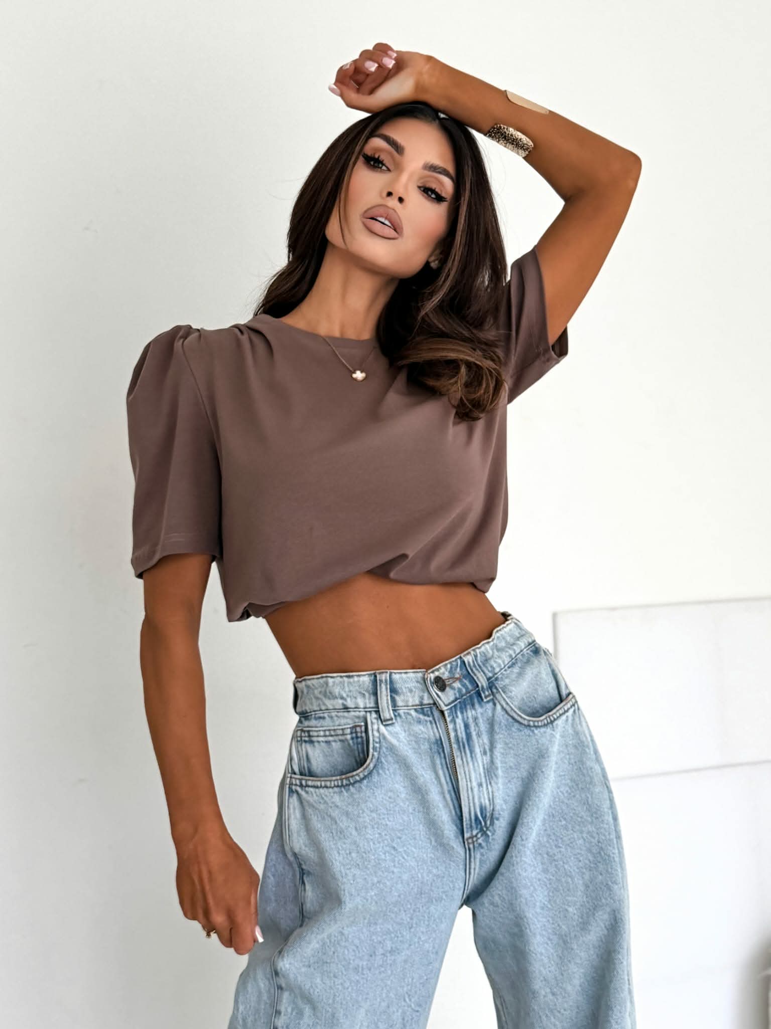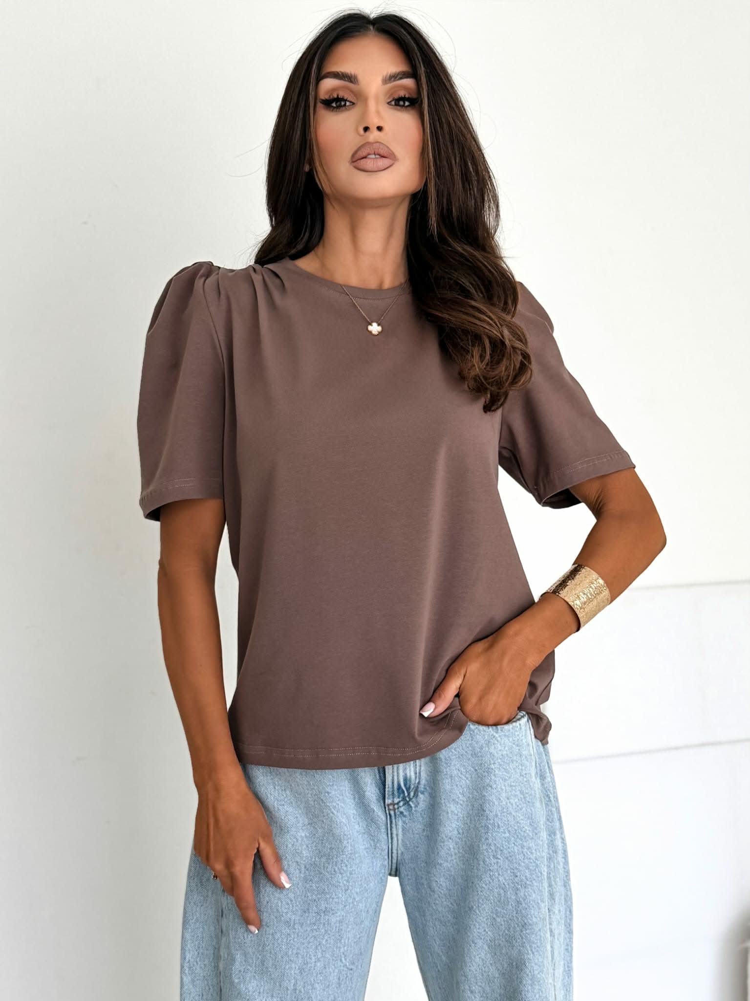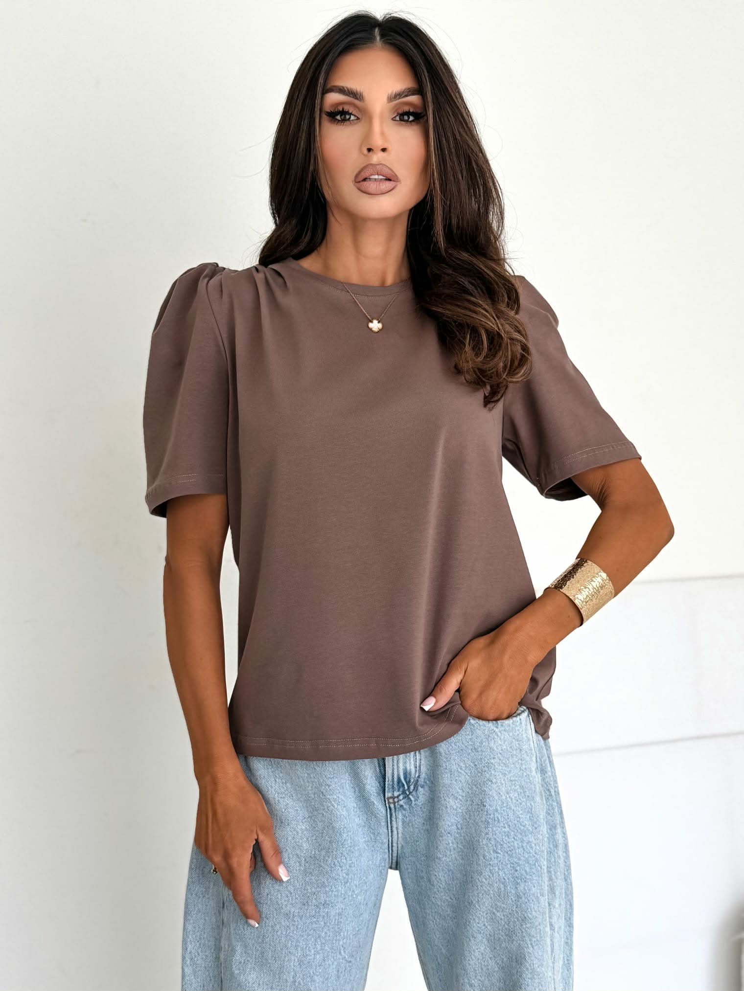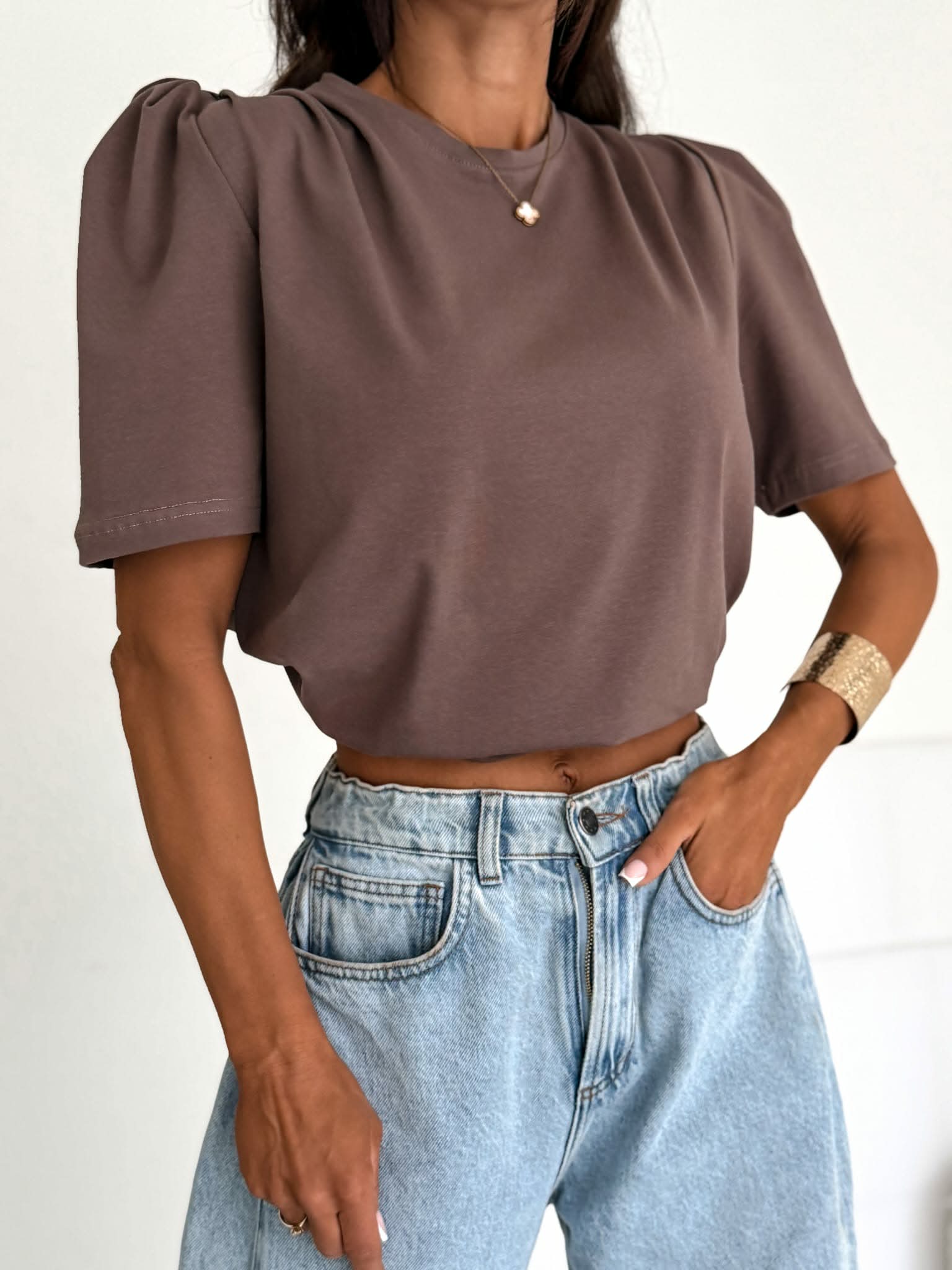 Prezentujemy Wam nowy wariant bluzki z bufką krótkim rękawem. Tym razem w odcieniu chocolate.