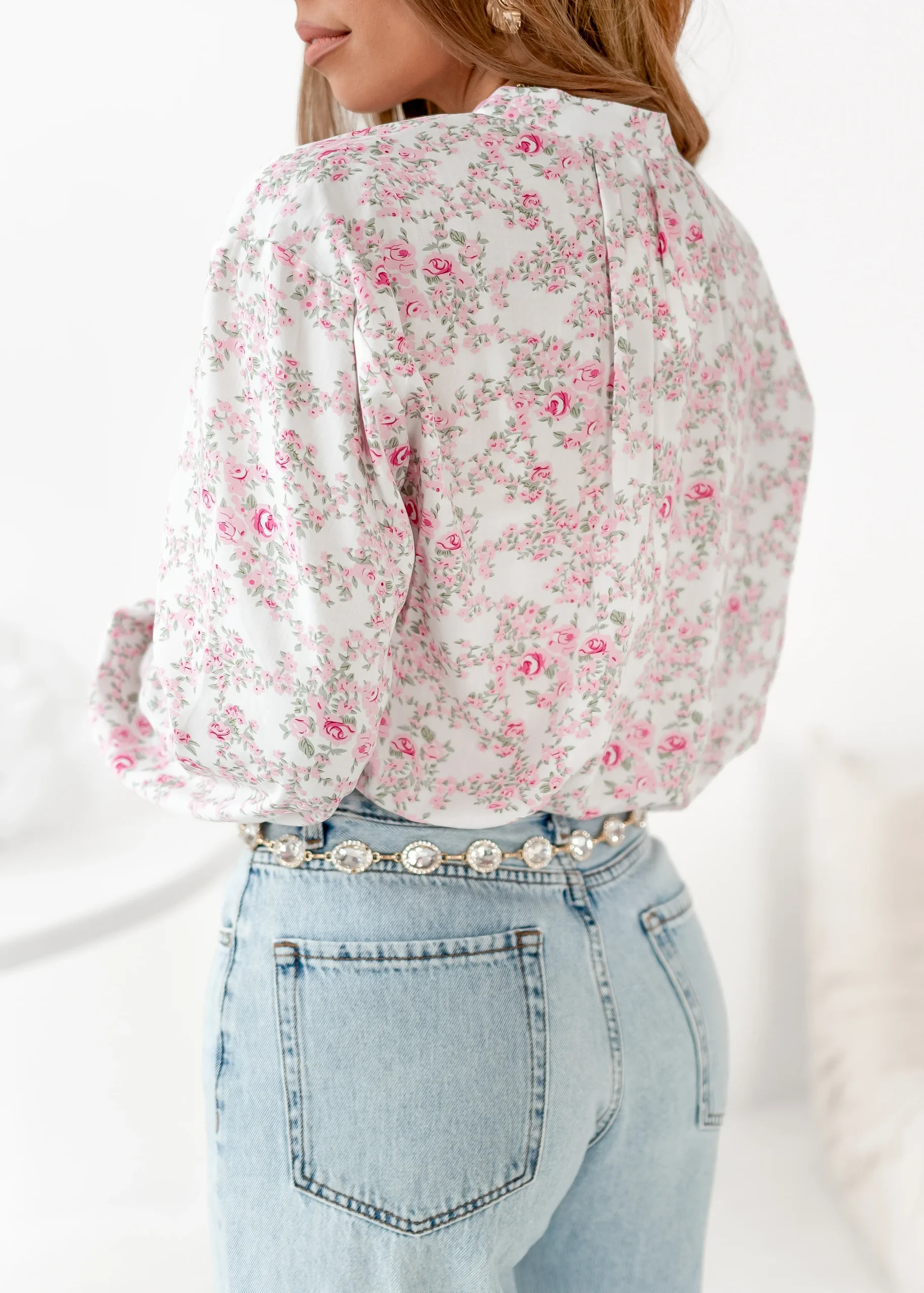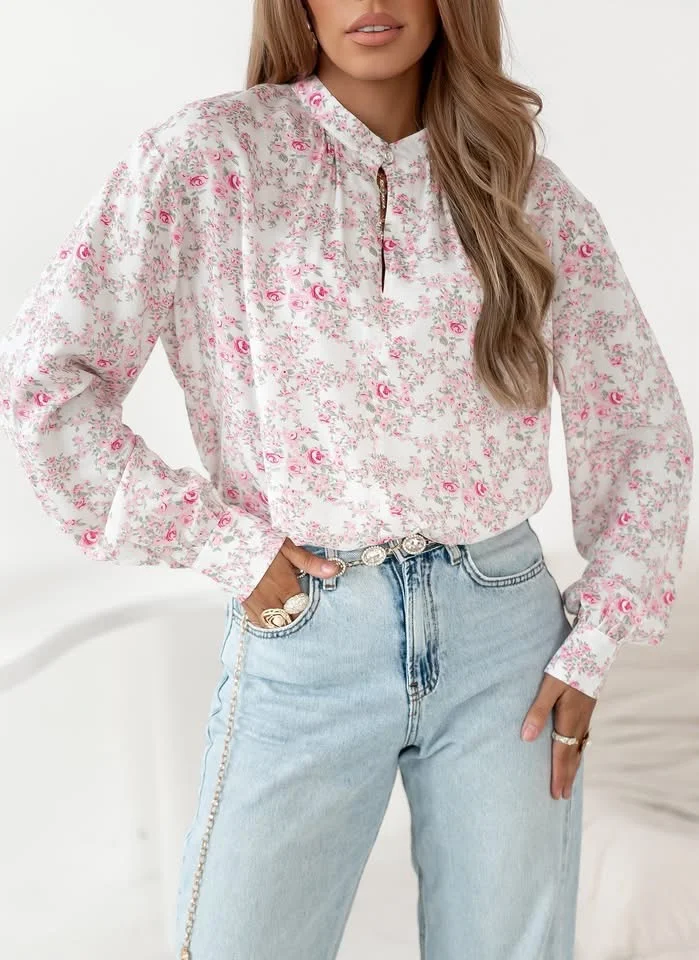 Bluzka o luźnym kroju. Subtelnie marszczona stójka zapinana na złoty, mały guzik. Na dekolcie tworzy się łezka. Rękawy zakończone mankietem. Delikatne marszczenia przy ramionach.