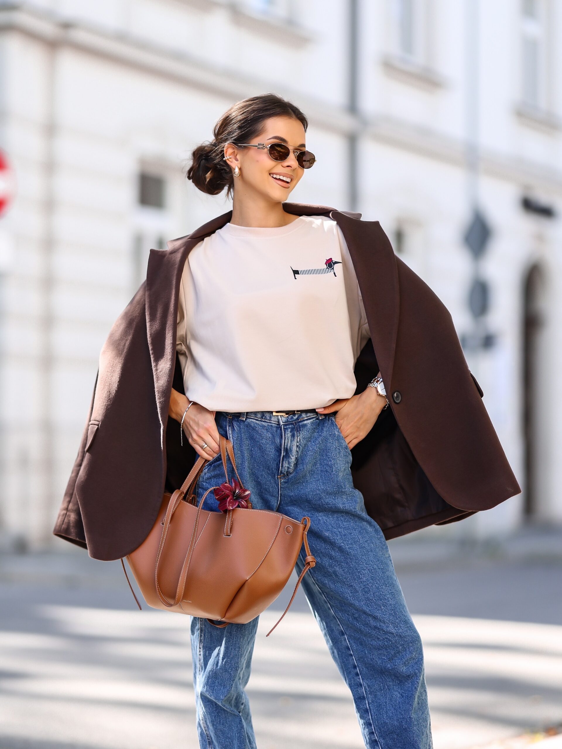 Postaw na modę, komfort i wyjątkowy design! Nasz t-shirt damski oversize w kolorze beżowym łączy luźny, wygodny krój z uroczym nadrukiem, który dodaje koszulce charakteru i wyróżnia Cię z tłumu.