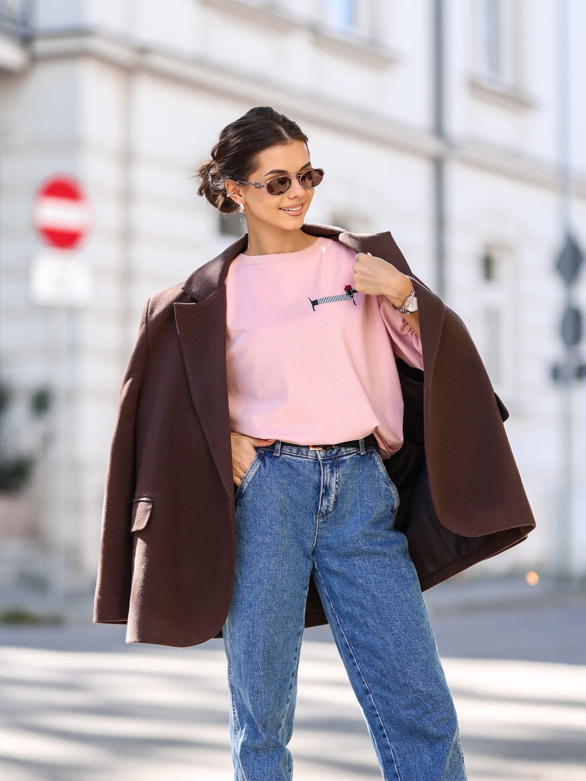 T-shirt damski oversize róż pudrowy z nadrukiem Jamnika Paris – premium, polska produkcja.