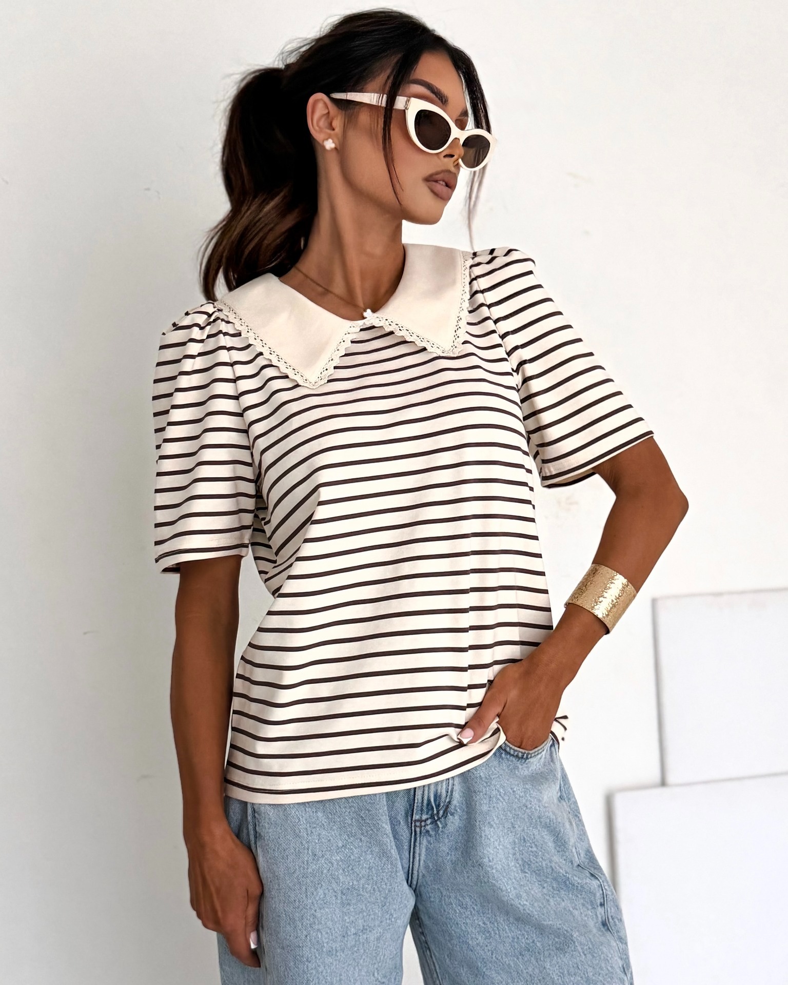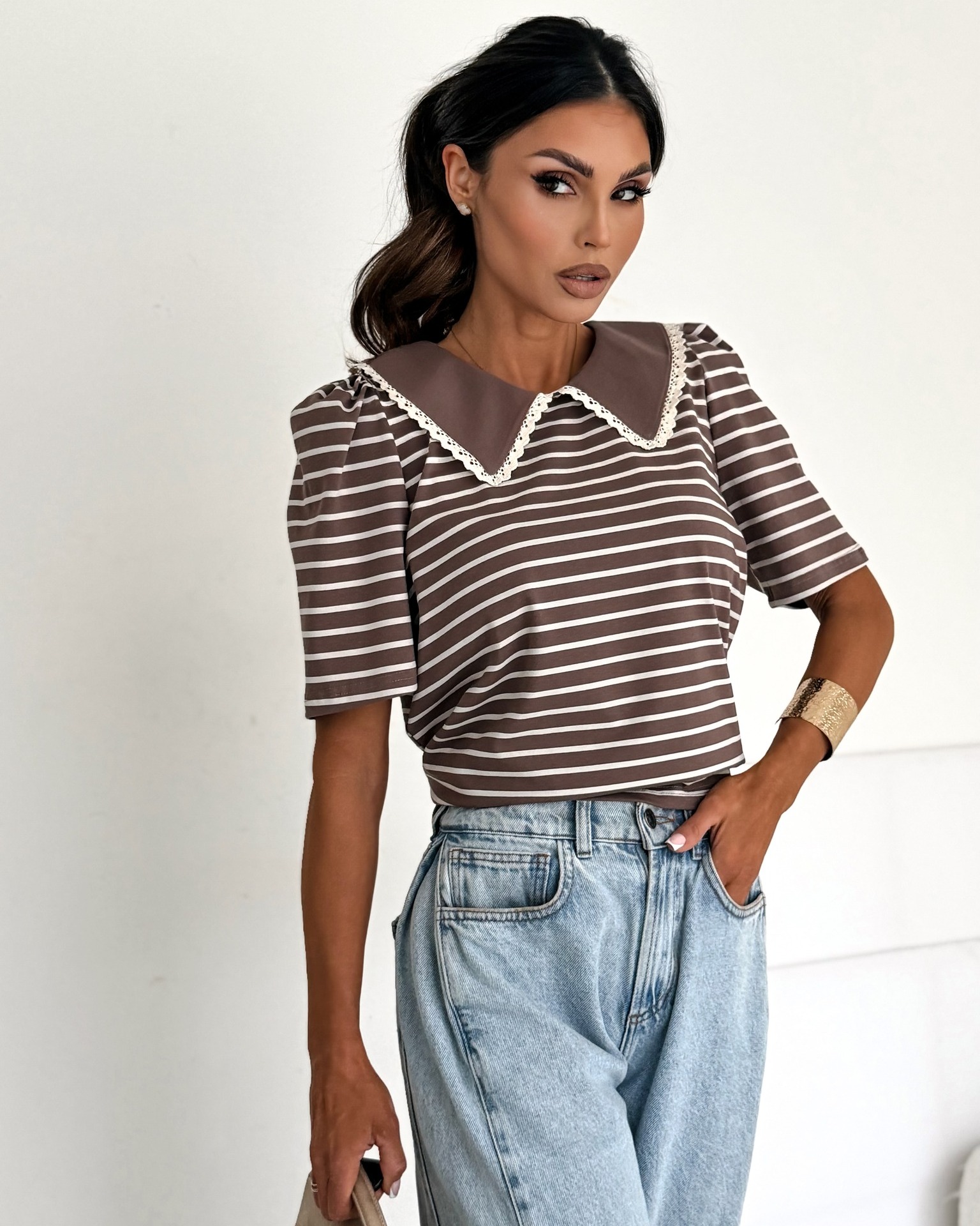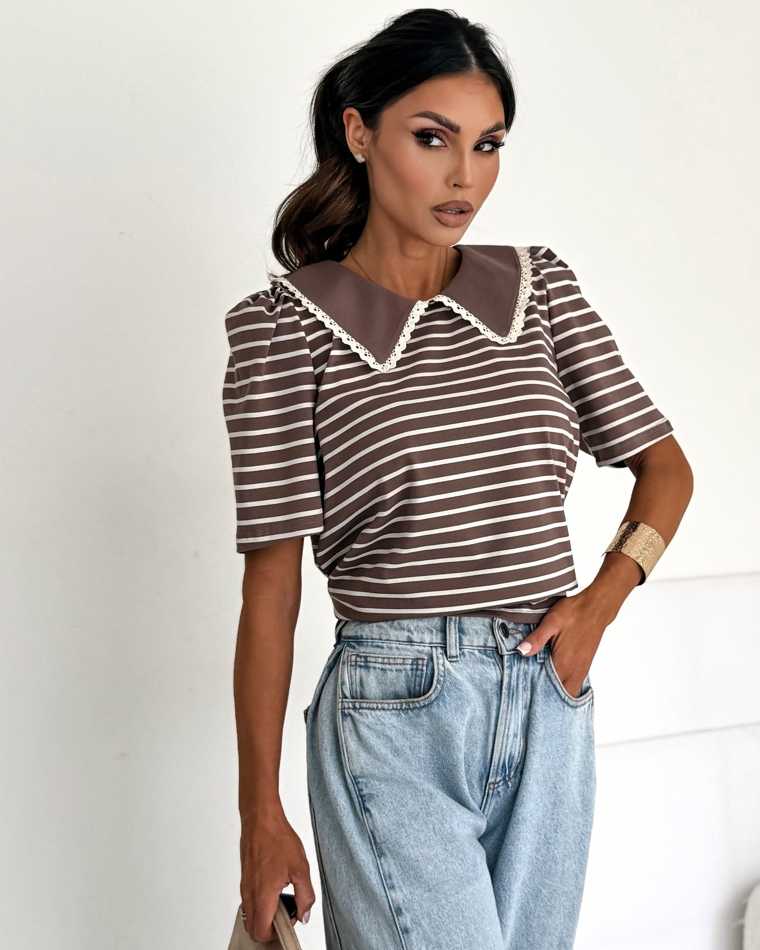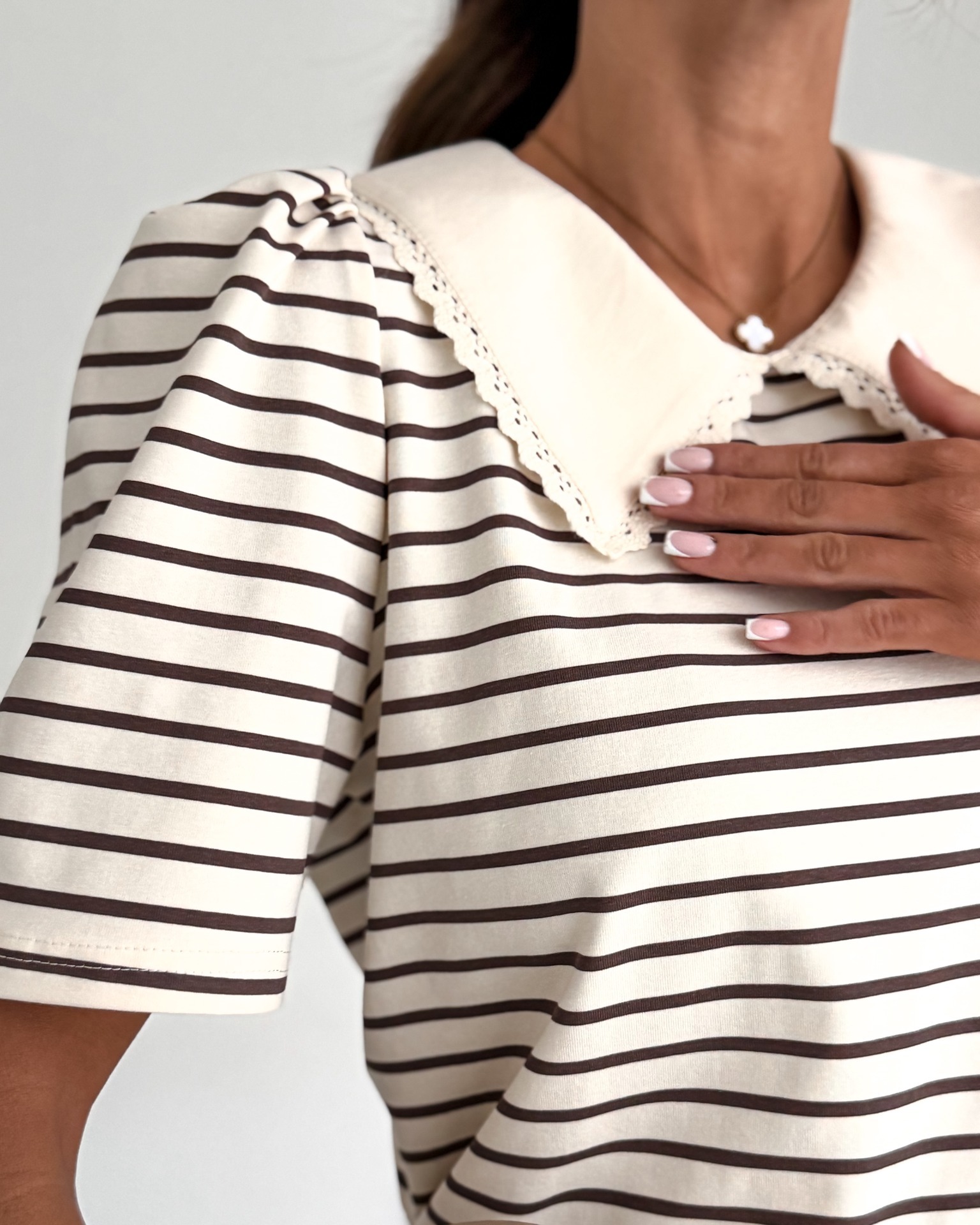 Stylowy i wyjątkowo dziewczęcy T-shirt wykonany z wysokiej jakości bawełny. Cudowne zestawienie kolorystyczne i zawsze modne paski, do tego kołnierzyk wykończony koronką podkreśla subtelny, elegancki charakter. Bufiaste rękawki oraz starannie dopracowane detale sprawiają, że model prezentuje się niezwykle efektownie. Z tyłu znajduje się praktyczne zapięcie na guziczek, które ułatwia zakładanie. T-shirt doskonale sprawdzi się zarówno w codziennych stylizacjach, jak i podczas bardziej eleganckich okazji. Cechy produktu: • wysokiej jakości bawełniany materiał • modny wzór w paseczki • kołnierzyk wykończony koronką • bufiaste rękawki • zapięcie na guziczek z tyłu • starannie dopracowane detale • produkt polski