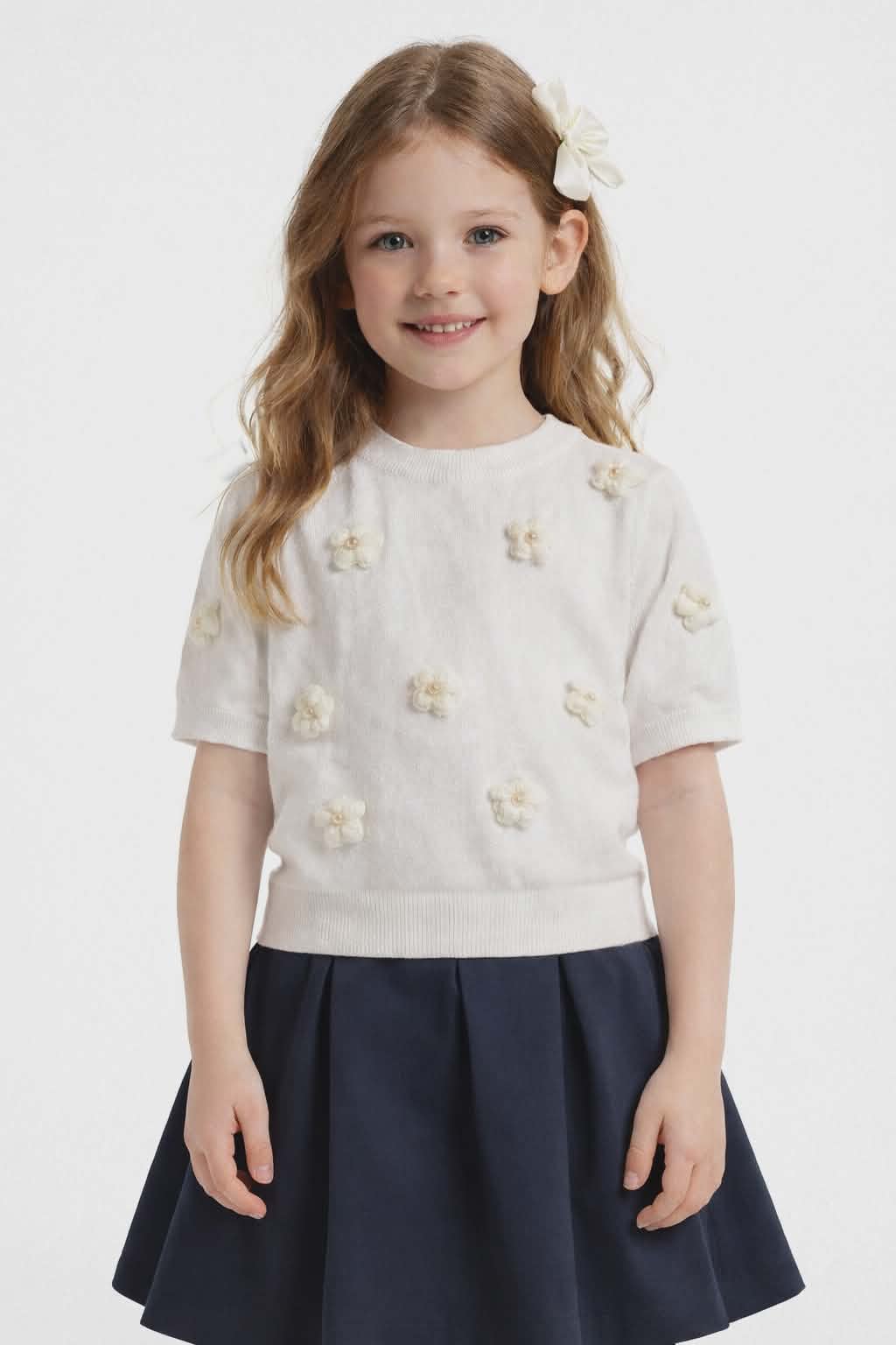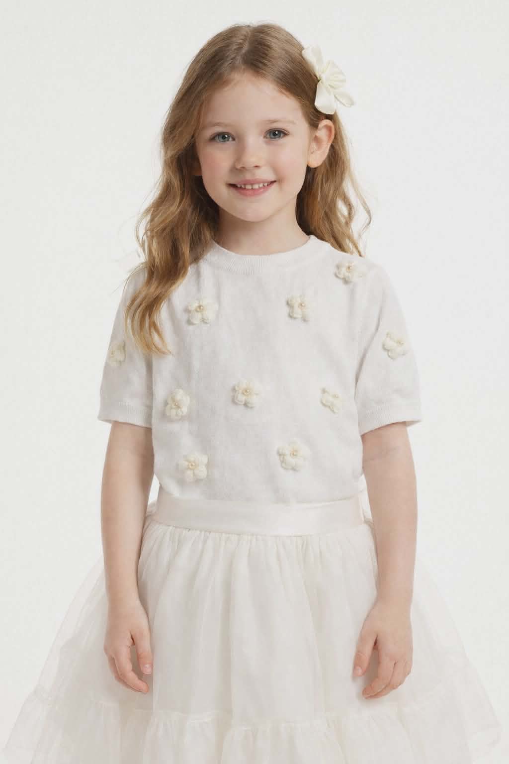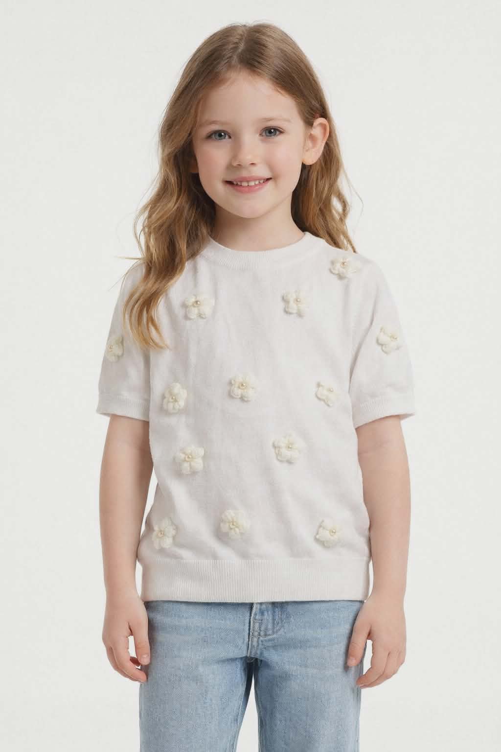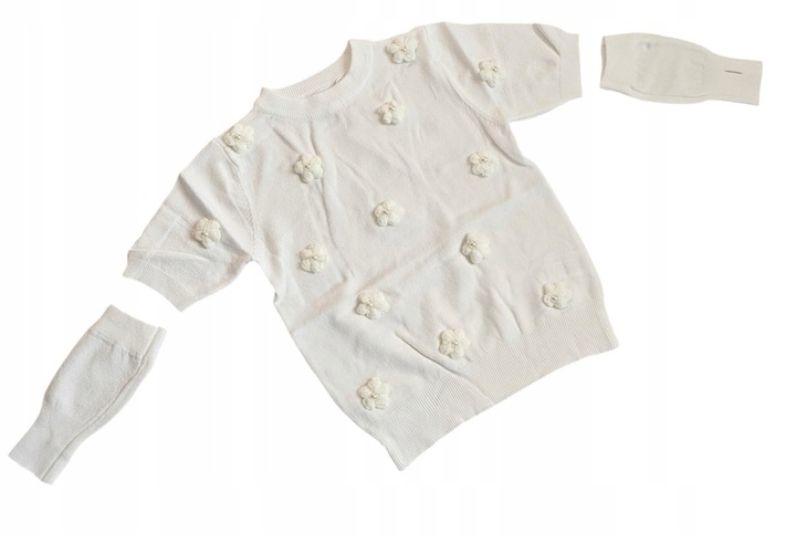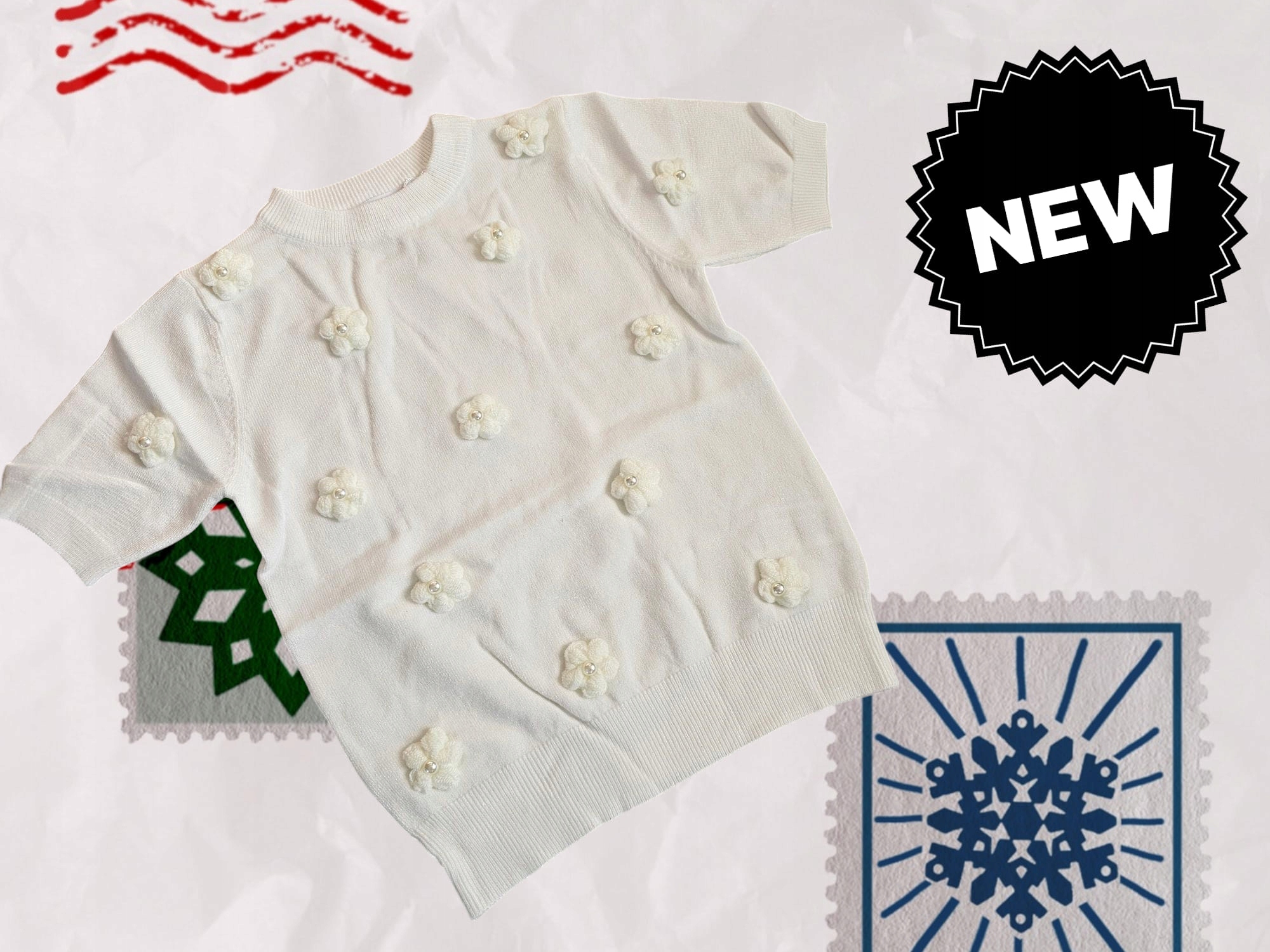❄️�� Przemiły w dotyku biały, cienki sweter z krótkim rękawem, ozdobiony trójwymiarowymi aplikacjami kwiatów. Kwiaty są równomiernie rozmieszczone na całej powierzchni dzianinowej bluzki i mają małe perełki w środku.
