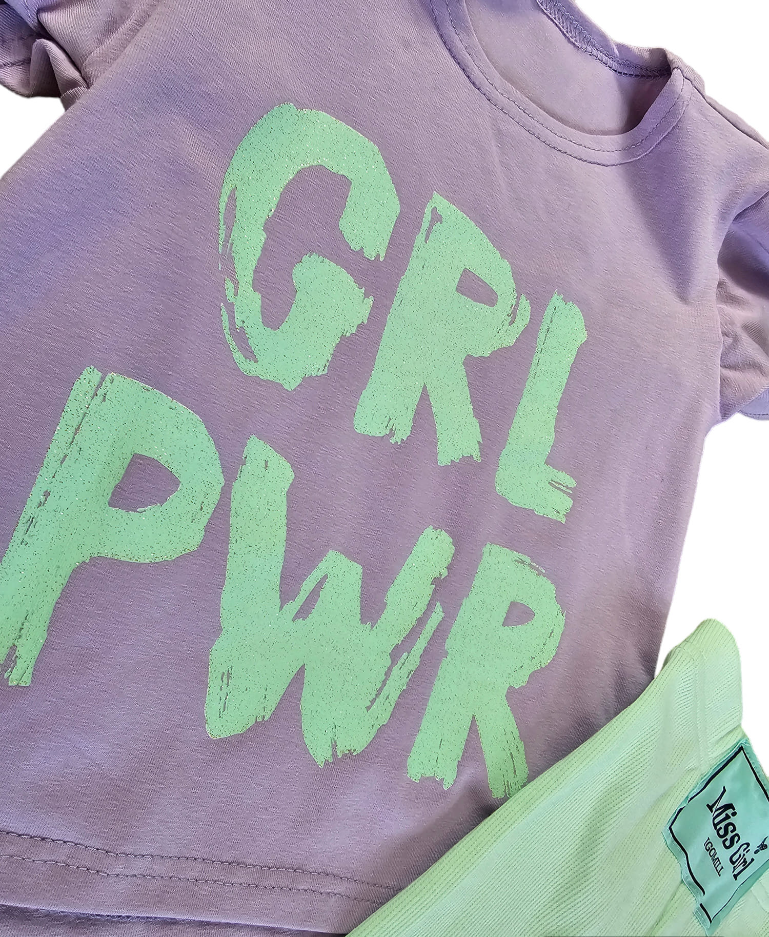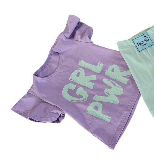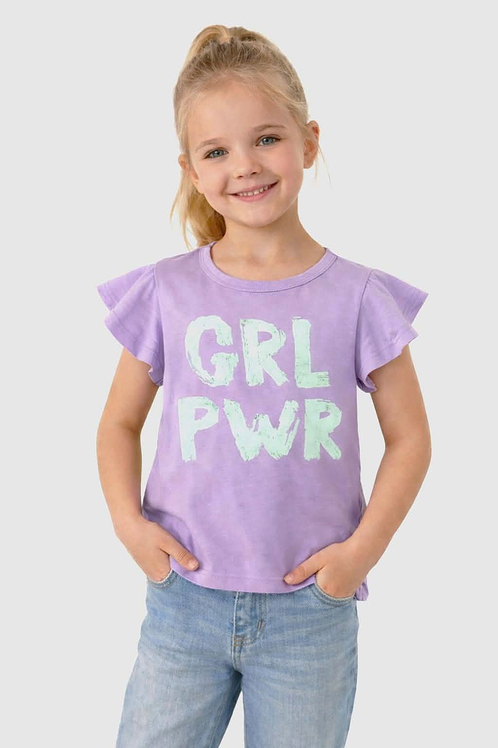 • Koszulka o klasycznym kroju z ozdobnymi, falbankowymi rękawkami w pięknym kolorze liliowym z idealnie pasującym miętowym napisem GRL PWR  – Siła Dziewczyn