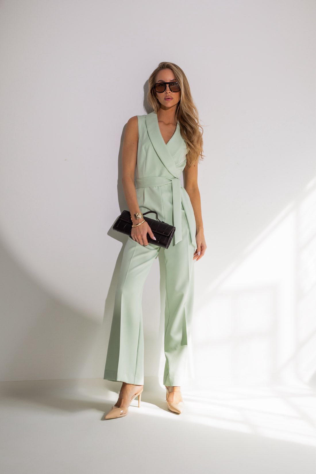 Kopertowy dekolt pięknie podkreśla szyję, a szerokie nogawki nadają sylwetce lekkości. Dodatkowy pasek w talii subtelnie ją zaznacza, wysmuklając optycznie całą figurę.