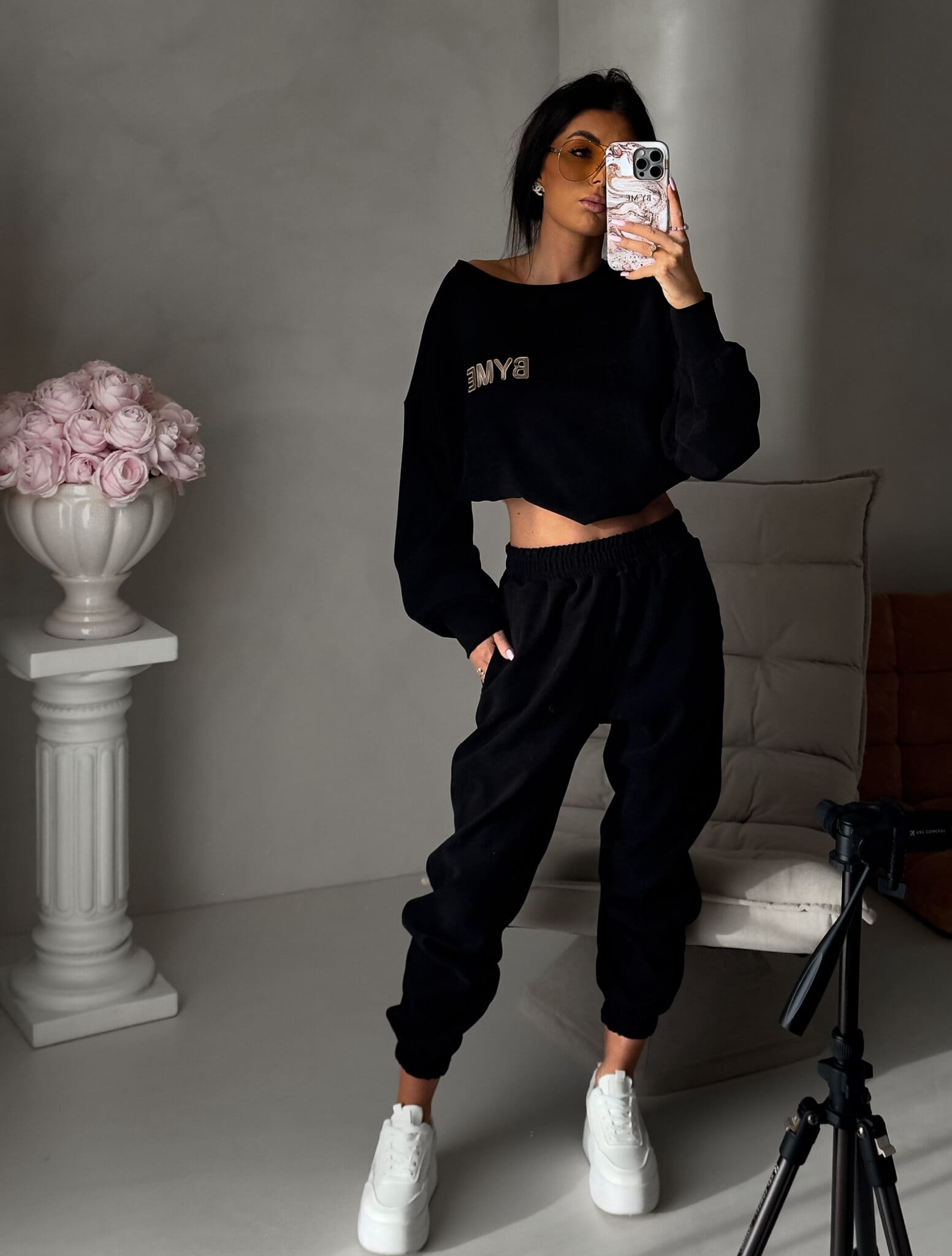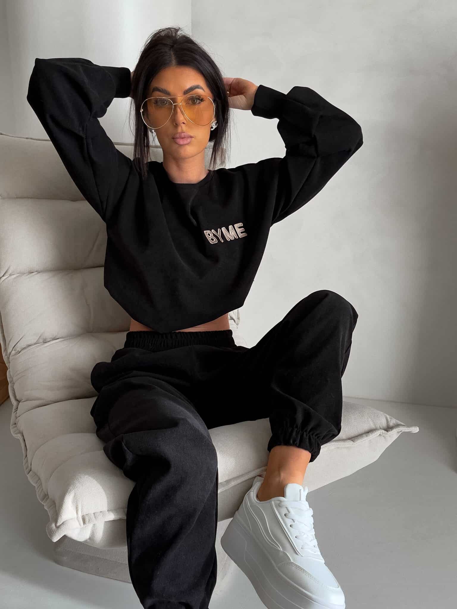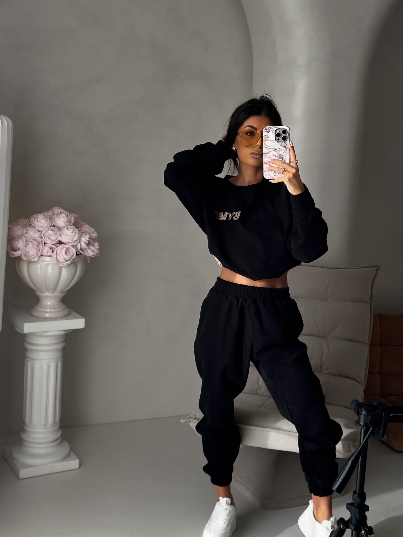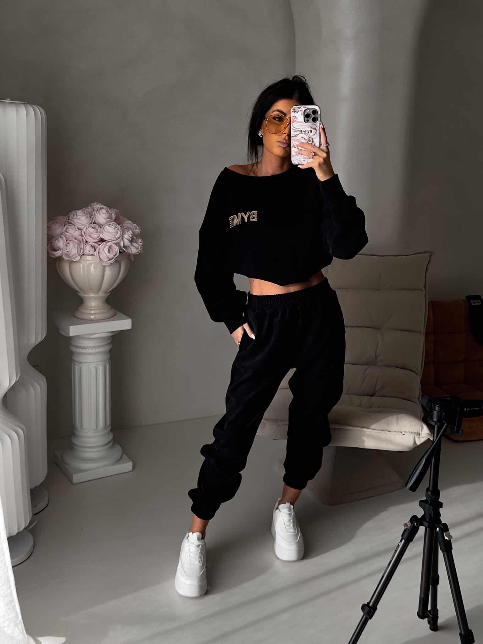 Komplet dresowy składający się z bluzy o luźnym kroju oraz dopasowanych spodni. Bluza posiada długie rękawy, klasyczny okrągły dekolt oraz subtelne logo umieszczone na piersi. Spodnie z wysokim stanem zapewniają komfort noszenia dzięki elastycznej gumce w pasie,