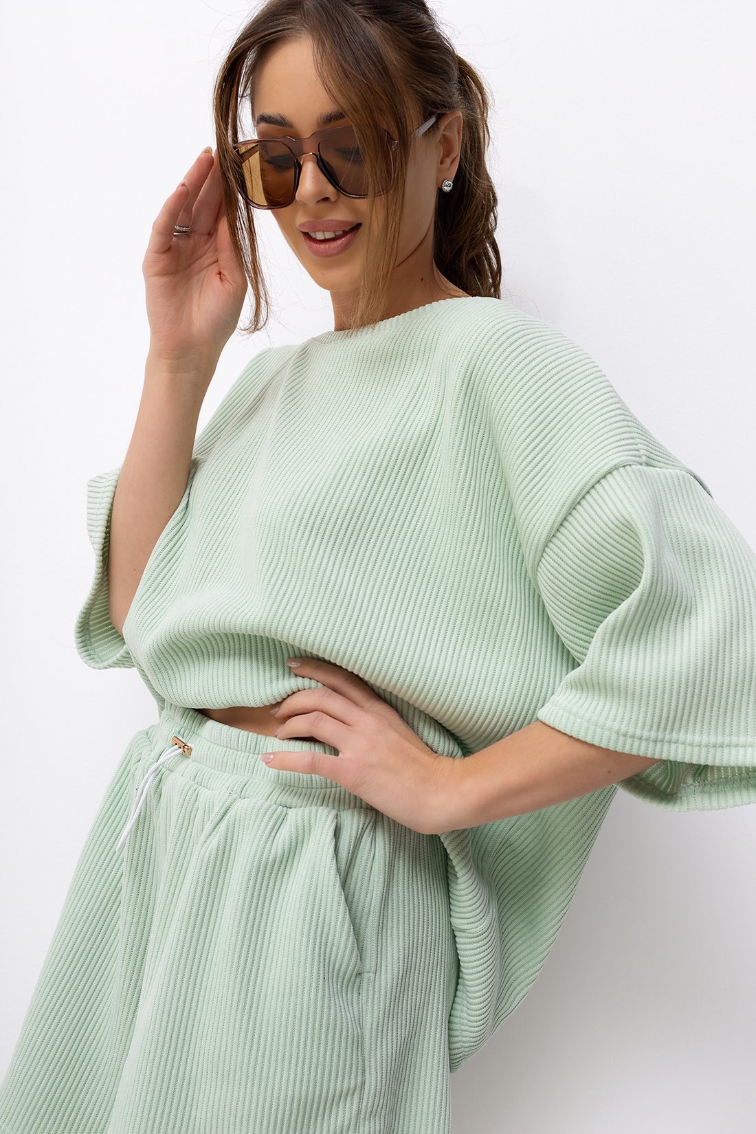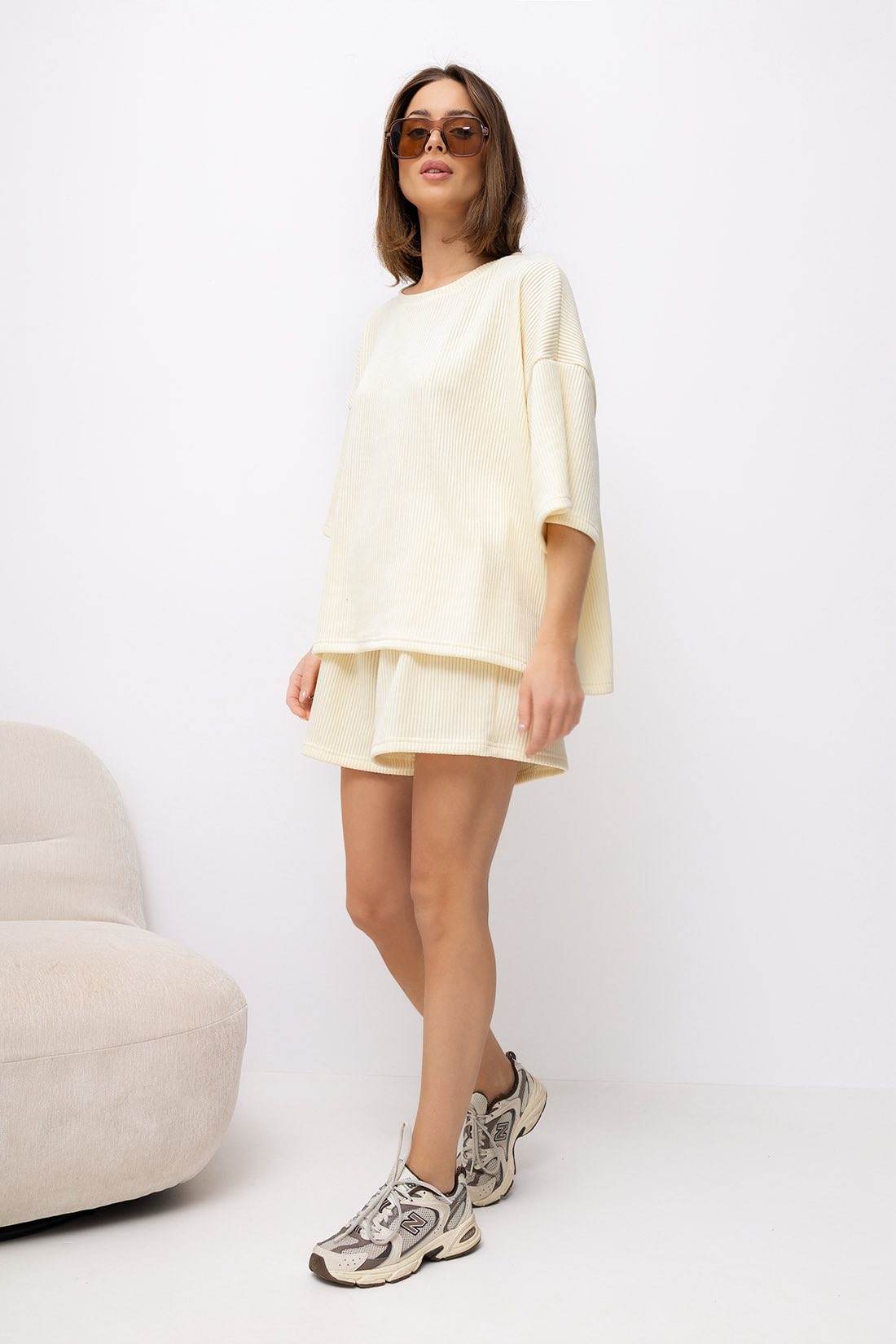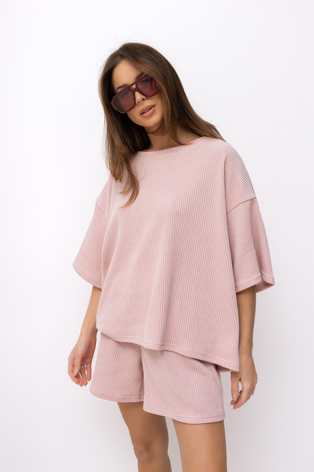 Stylowy komplet wykonany z miękkiego, przyjemnego w dotyku materiału o strukturze sztruksu. Idealna propozycja na codzienne stylizacje – łączy wygodę z modnym, minimalistycznym wyglądem. Luźniejszy t-shirt zapewnia swobodę ruchów, a szorty ze ściągaczem w pasie dopasowują się do sylwetki.