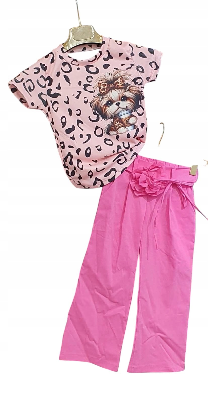 • � Uroczy komplet dla dziewczynki 🌸✨ Stylowy i wygodny zestaw dla małej modnisi! ✨🔸 Bluzka w modny panterkowy wzór z uroczym pieskiem 🐶 – idealna dla dziewczynki, która kocha zwierzęta i stylowe nadruki!