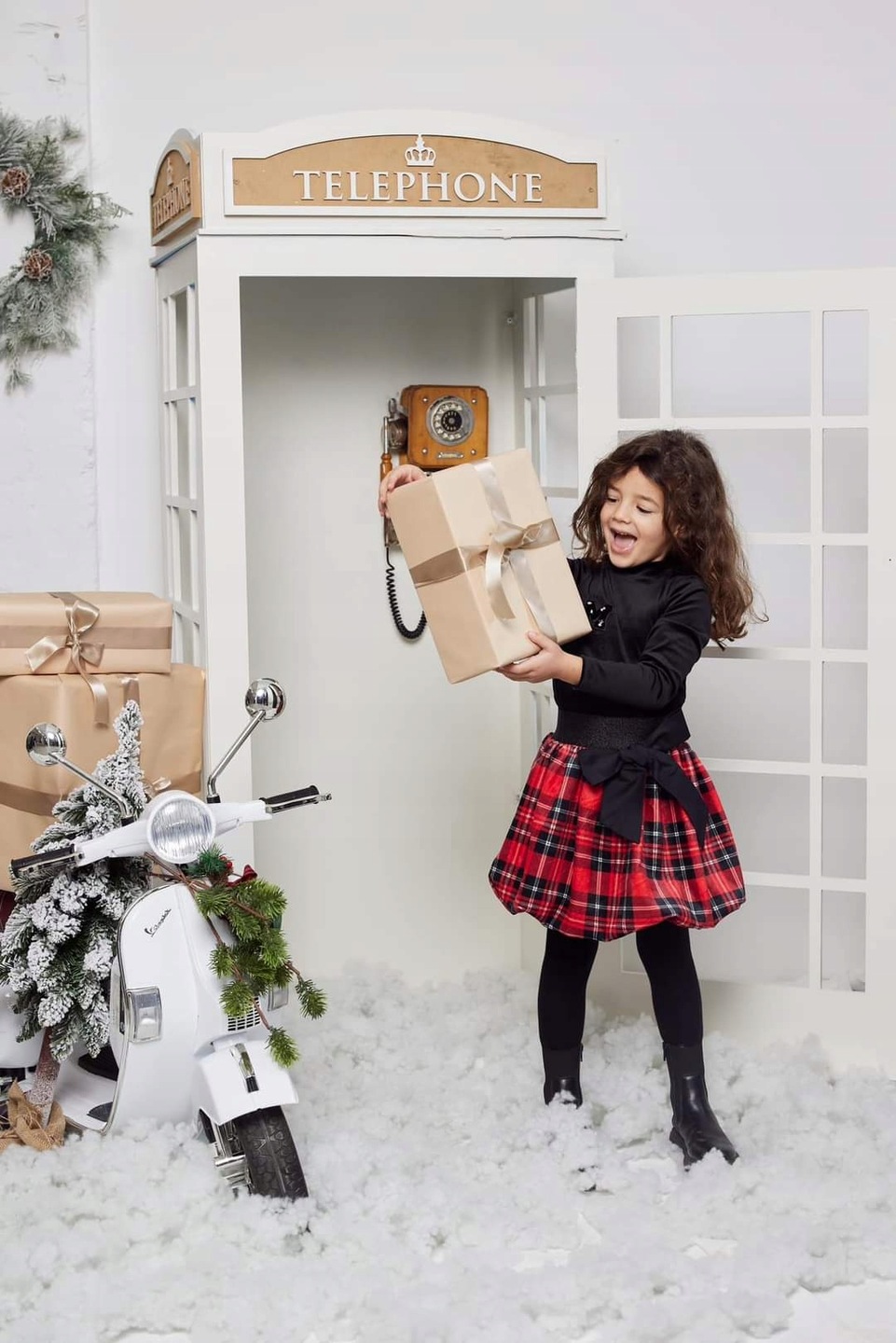 Bluzka welur oraz czerwona spódnica bombka w kratę.