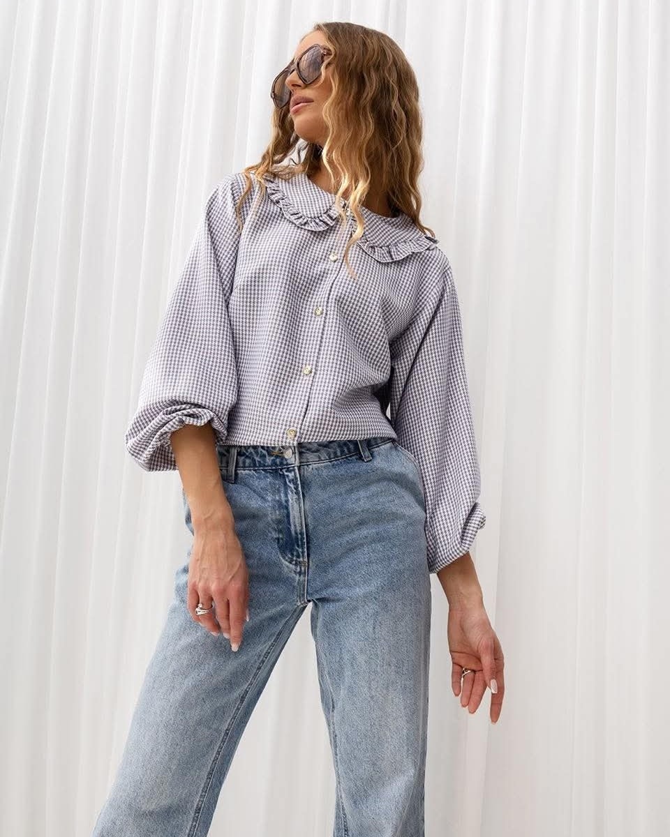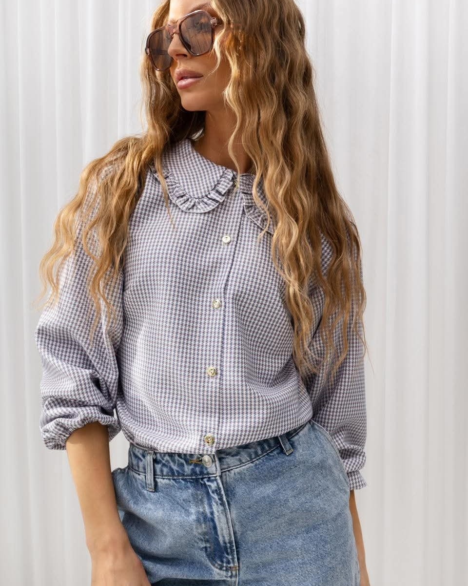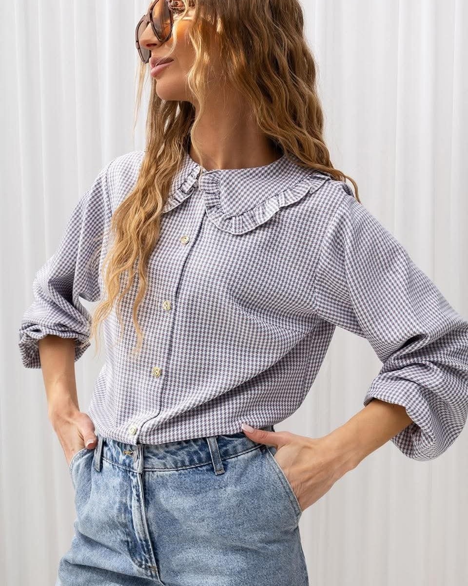 Kobiece koszule w delikatną kratkę lub gładkie z uroczym, ozdobnym kołnierzykiem wykończonym falbanką.