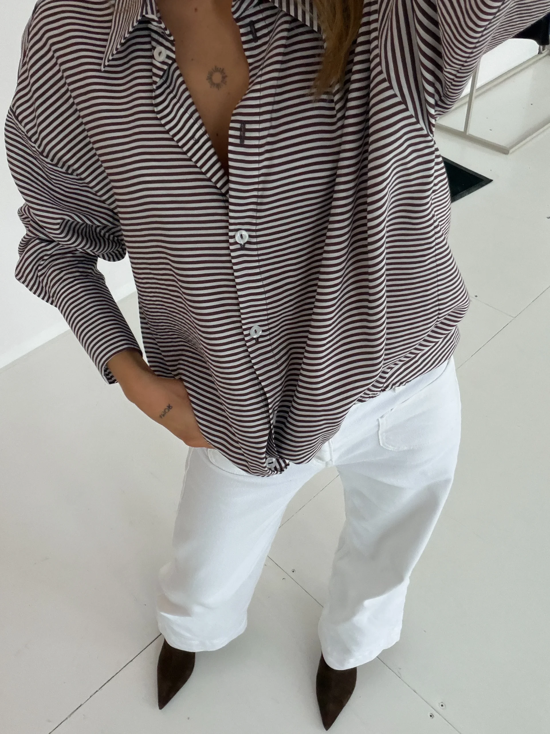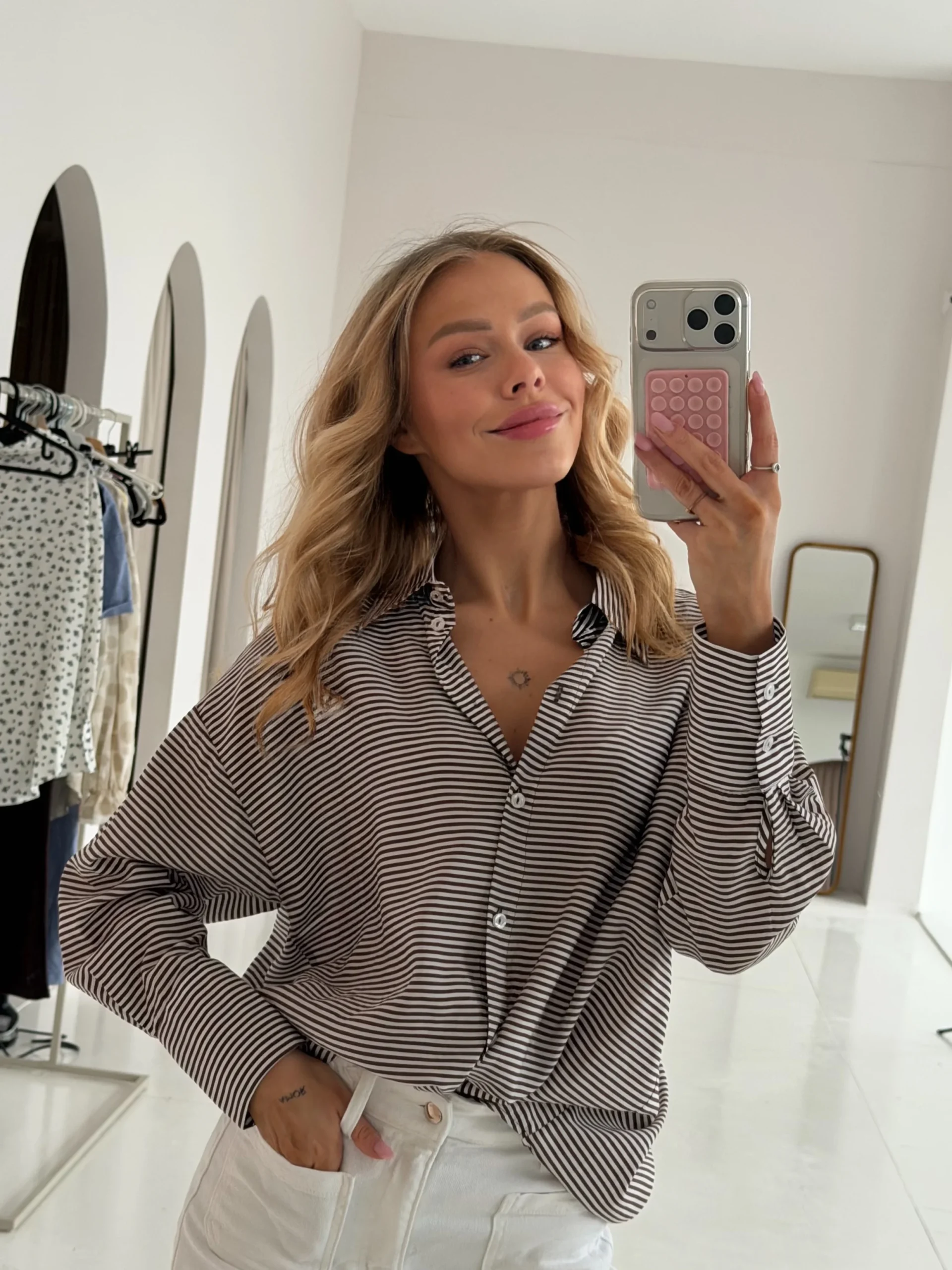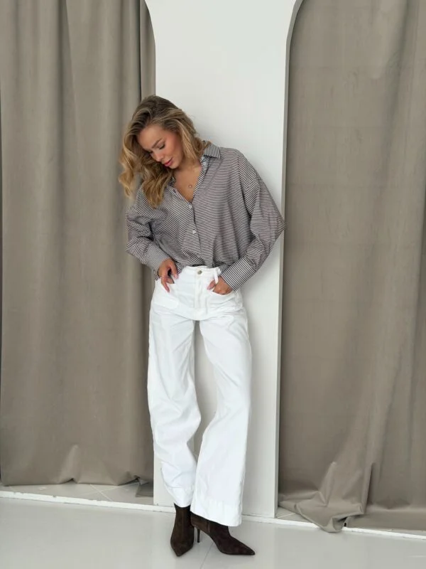 Koszula o swobodnym fasonie. Zapinana na złote, małe guziki. Rękaw wykończony wysokim mankietem. Obniżona linia ramion. Z łatwością połączysz ją z różnymi elementami swojej garderoby.