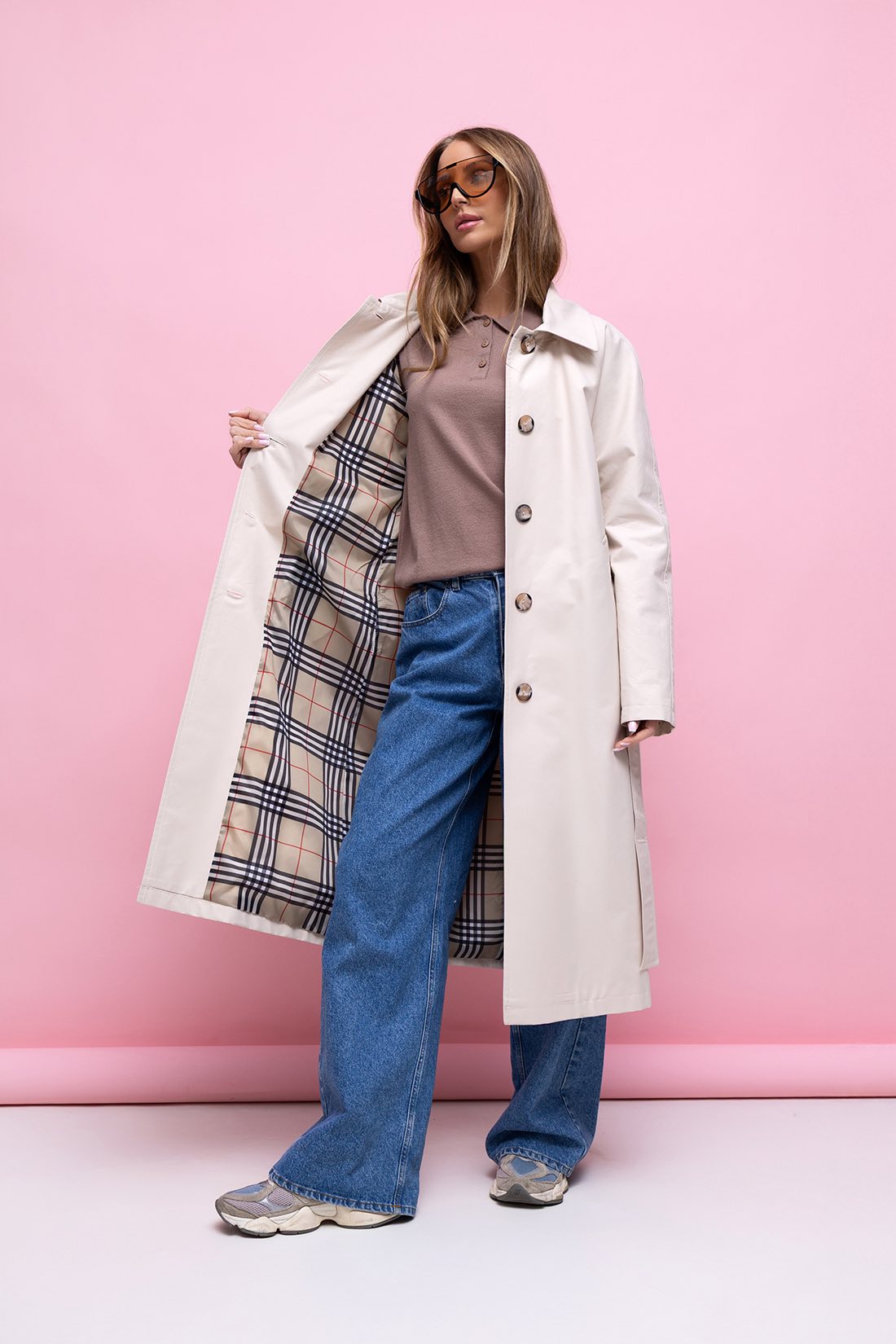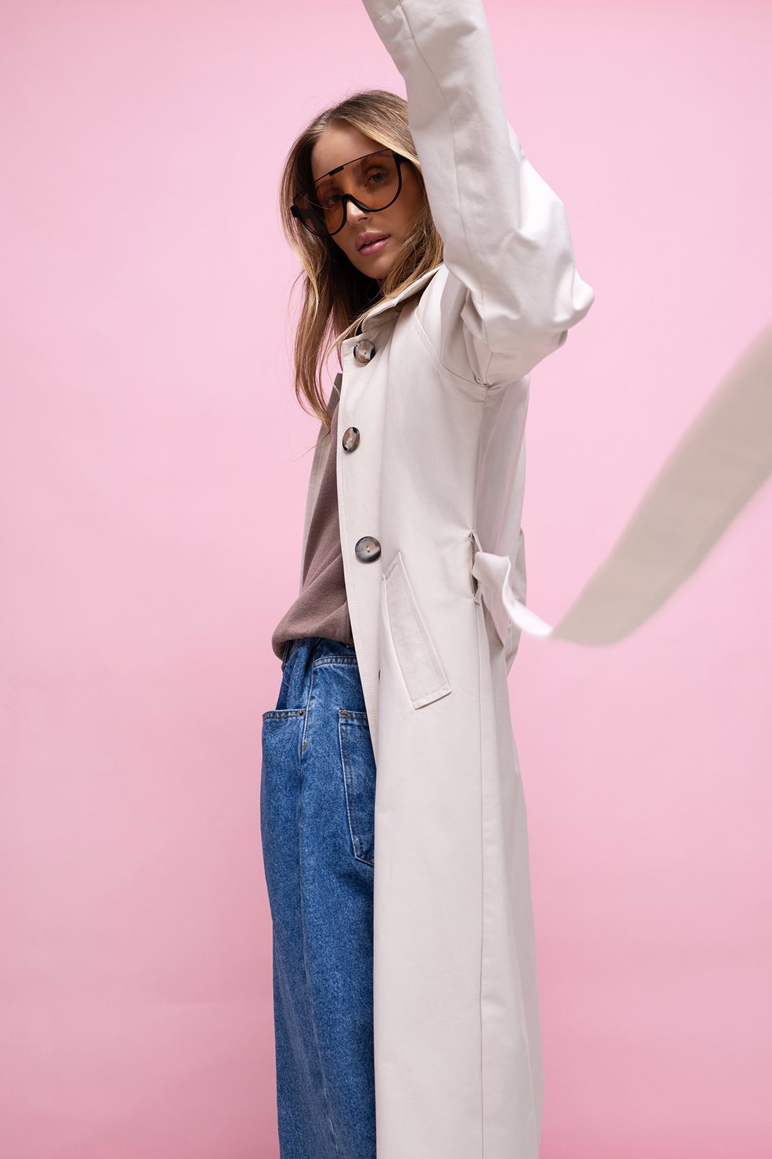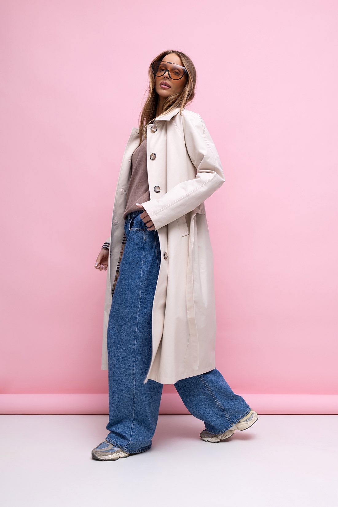 Stylowy damski płaszcz typu trencz, który idealnie łączy klasyczną elegancję z nowoczesnym, casualowym luzem. Model o ponadczasowym kroju z paskiem w talii pięknie podkreśla sylwetkę i pozwala na indywidualne dopasowanie. Wykonany z lekkiego, komfortowego materiału — doskonały na sezon przejściowy. Wyjątkowego charakteru nadają mu kontrastowe detale przy mankietach, które subtelnie przełamują klasyczną formę. Trencz świetnie sprawdzi się zarówno w codziennych stylizacjach z jeansami i sneakersami, jak i w bardziej eleganckich zestawach.