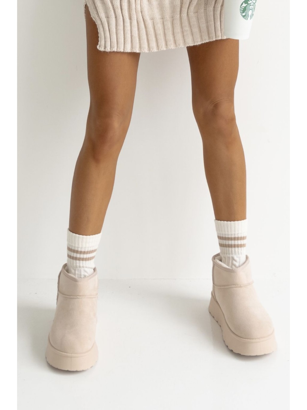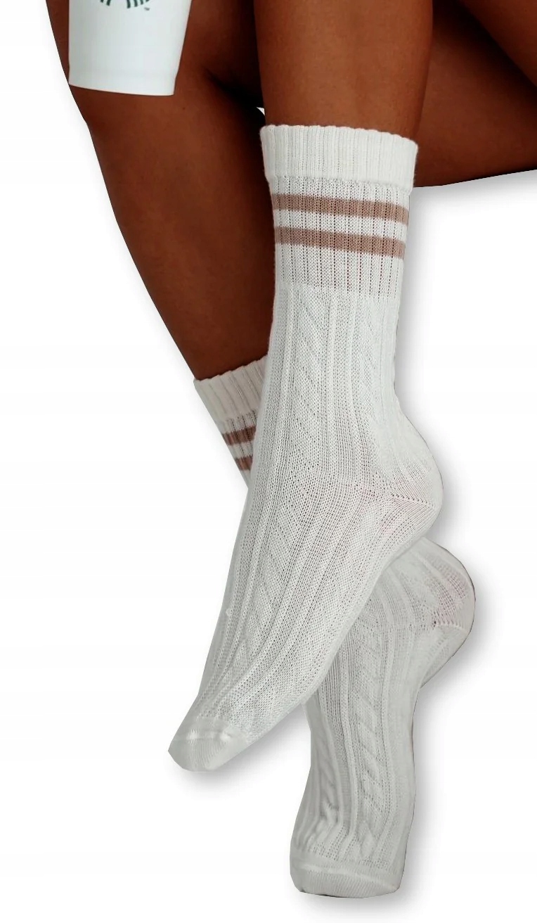 Bardzo kobiece skarpety polskiej produkcji w pięknym kolorze ecru z delikatnymi pasami w kolorze beżowym nad kostką. Skarpety zdobione są romantycznym wzorem warkocza. Idealnie komponują się ze stylizacjami na codzień, jak i tymi bardziej eleganckimi.