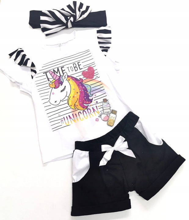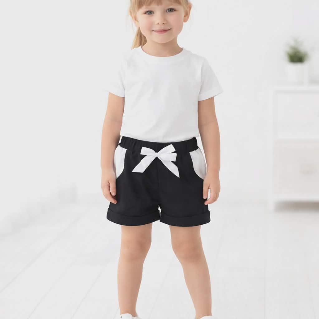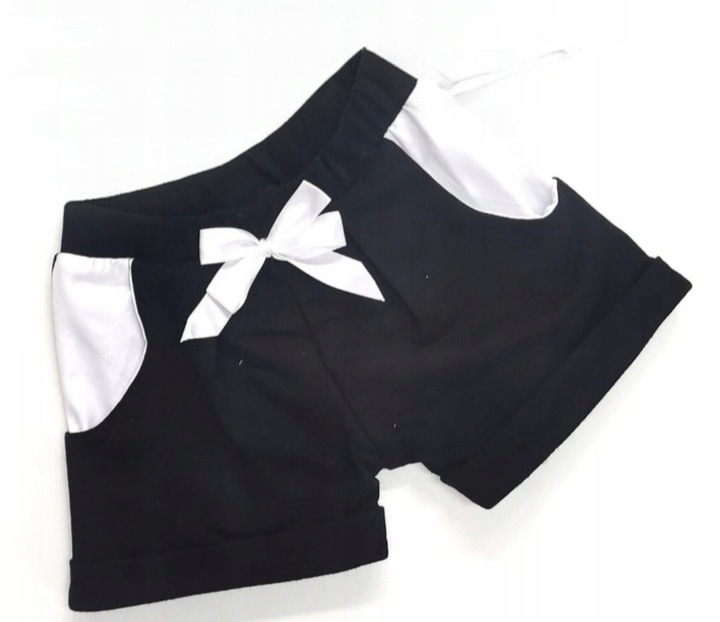 Czarne szorty z wywijaną nogawką i białymi wstawkami przy kieszonkach. Ozdobna kokardka dodaje spodenkom dziewczęcego uroku.
