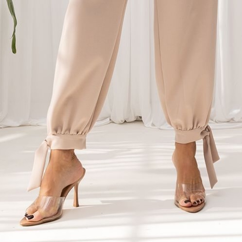 Długie nogawki zakończone regulowanym wiązaniem na kokardkę wprowadzają delikatny, kobiecy akcent i pozwalają dopasować ich szerokość.