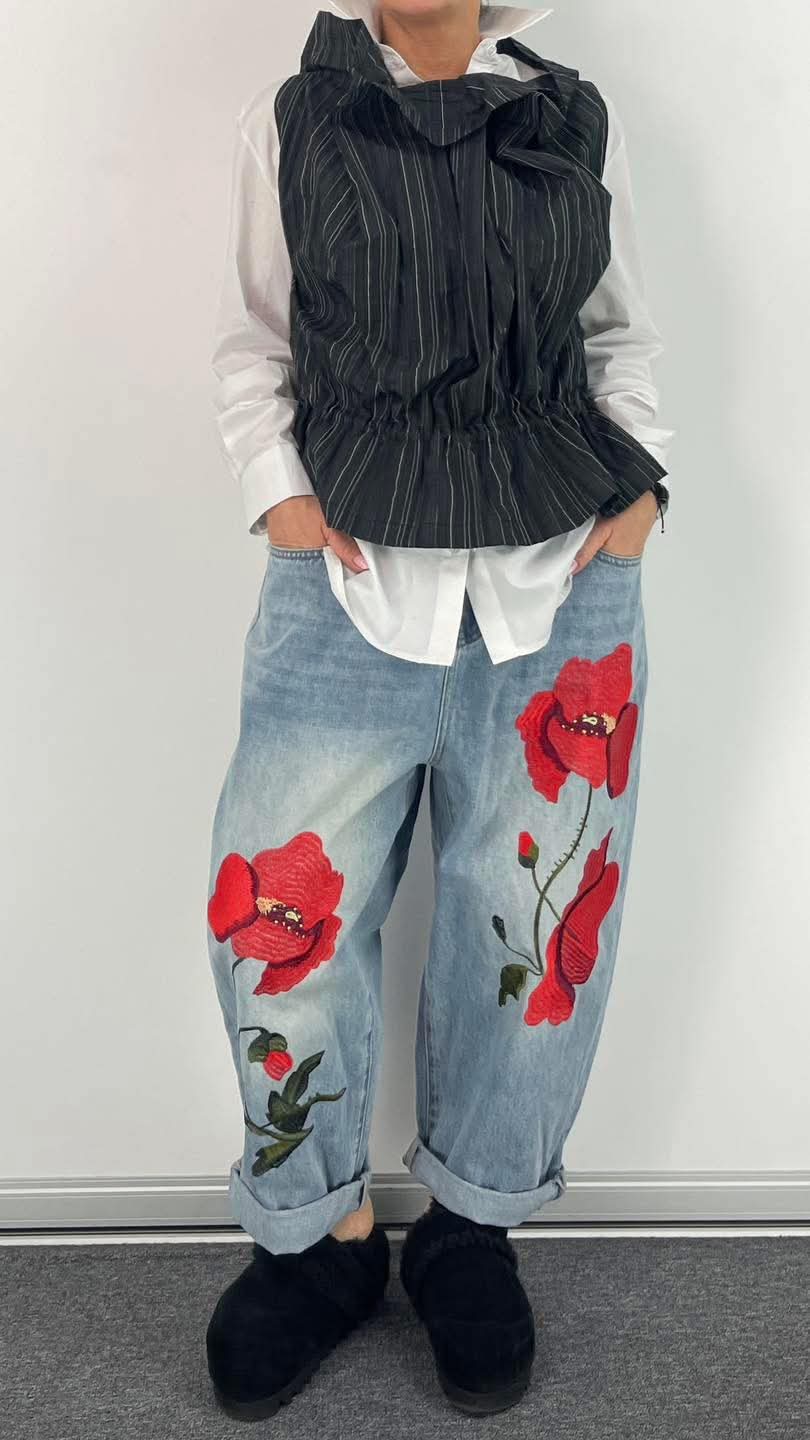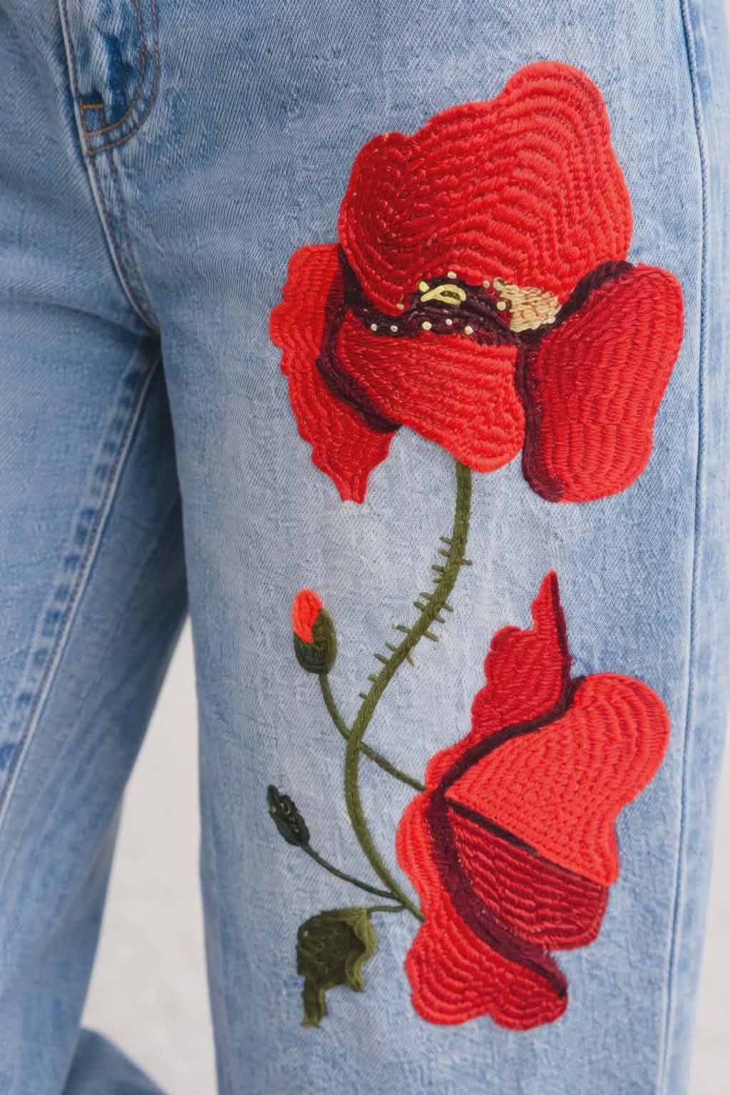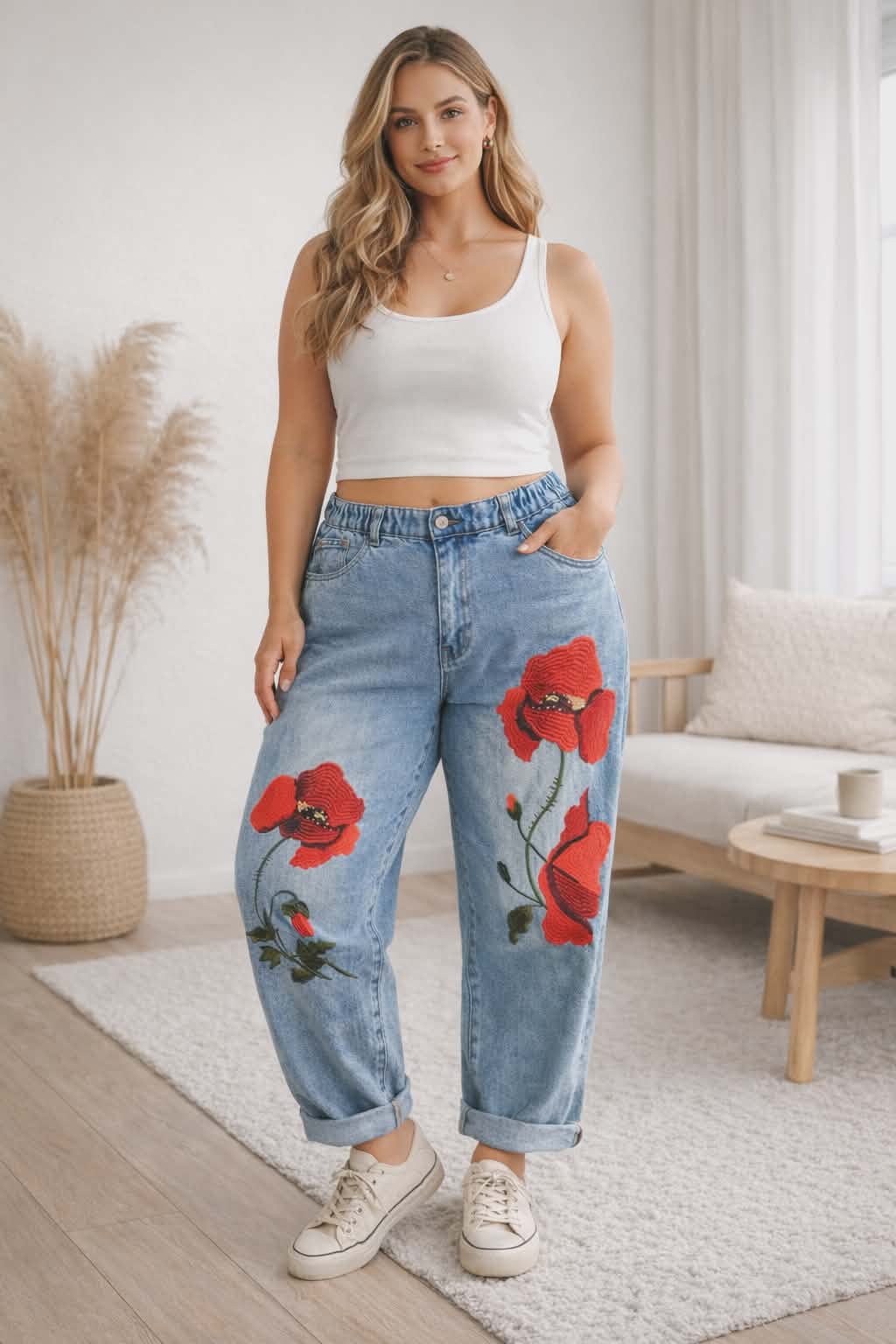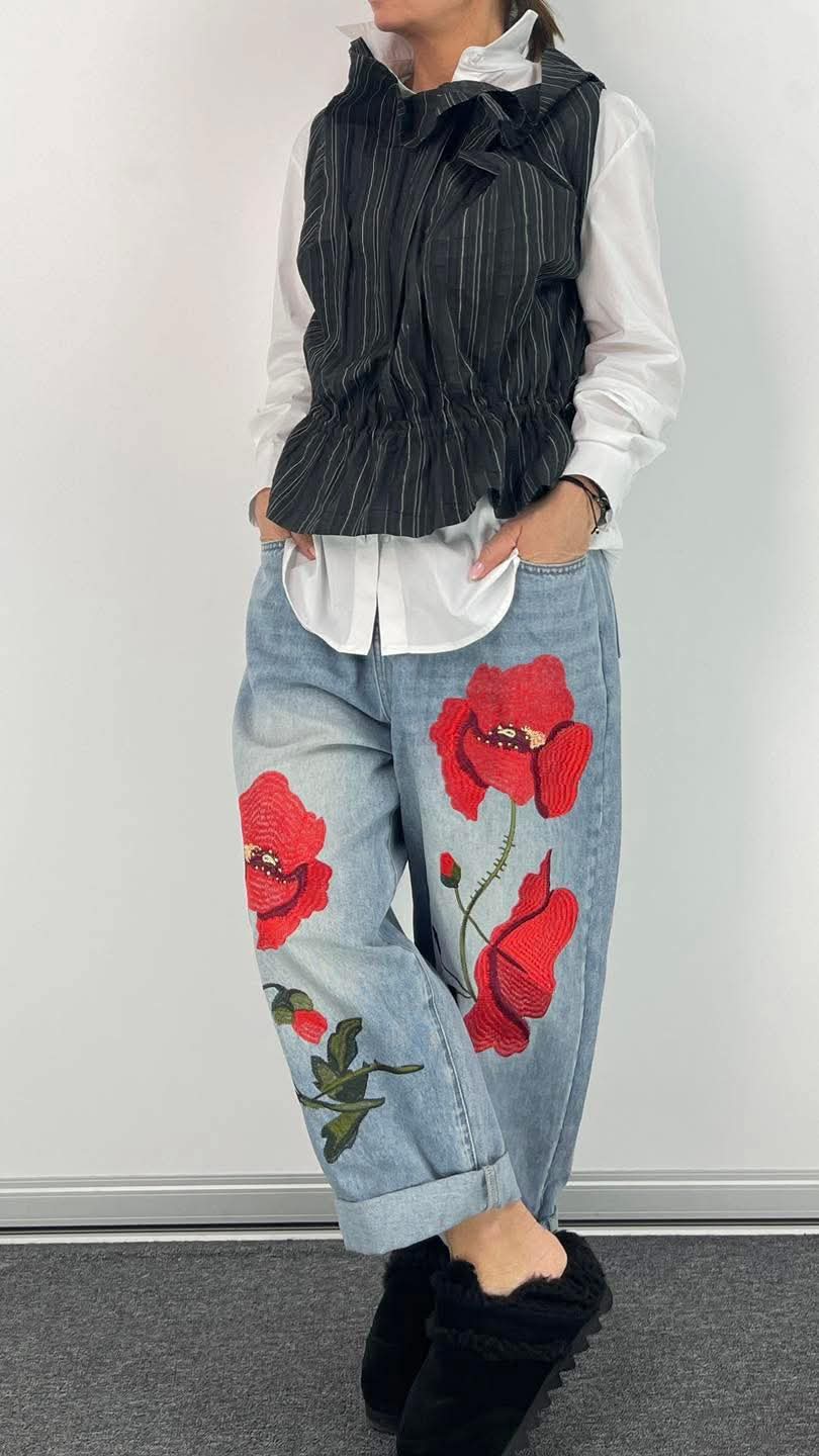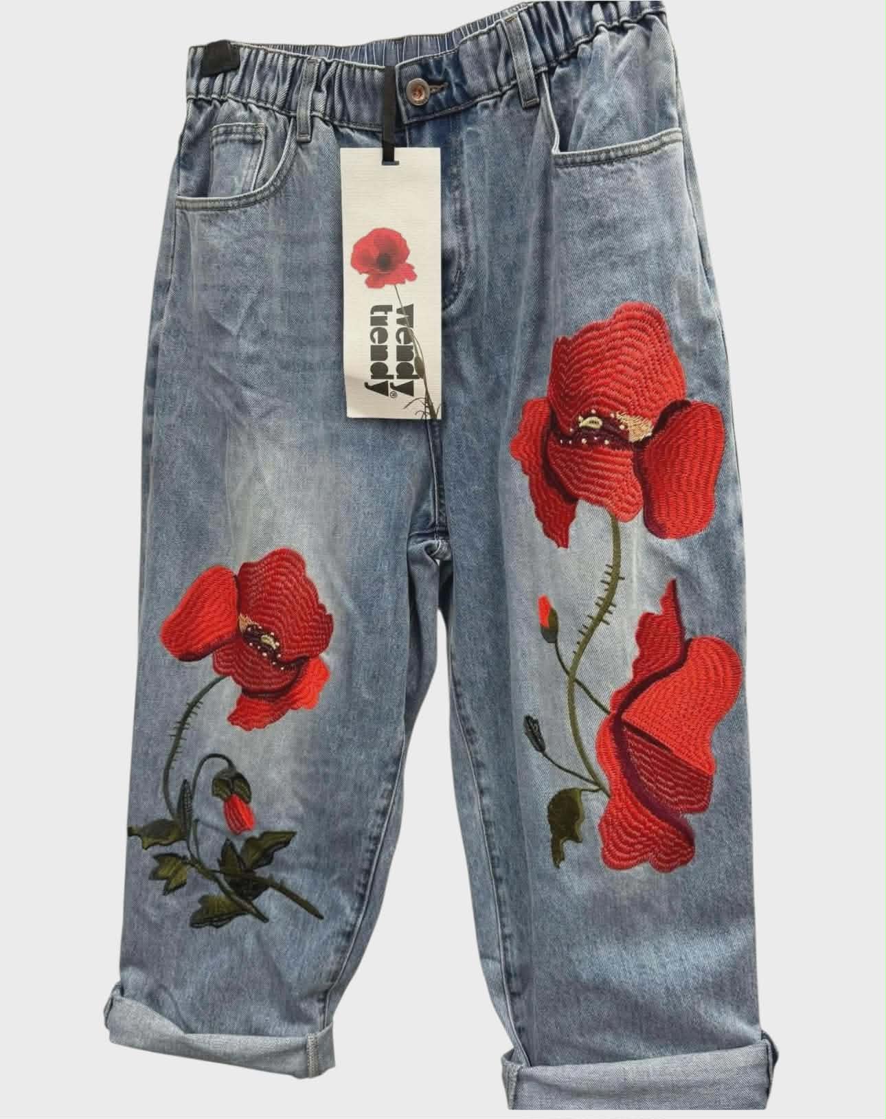 Wyjątkowe jeansy stworzone z myślą o kobietach, które cenią oryginalny styl, komfort i dopracowane detale. Model wyróżnia się artystycznym haftem w intensywnie czerwone maki, który nadaje całości niepowtarzalnego, luksusowego charakteru. Miękki, wysokiej jakości jeans z delikatnym efektem sprania pięknie układa się na sylwetce. Elastyczna guma w pasie zapewnia wygodę i doskonałe dopasowanie, a lekko podwinięte nogawki dodają modnego, nonszalanckiego szyku. To idealne spodnie do stylizacji casualowych i smart-casual – od codziennych zestawów po bardziej eleganckie looki. ✦ Dlaczego je pokochasz: ekskluzywny haft kwiatowy w odcieniu czerwieni wygodny, elastyczny pas na gumie miękki, przyjemny w dotyku jeans premium ponadczasowy fason z modnym wykończeniem komfort noszenia przez cały dzień