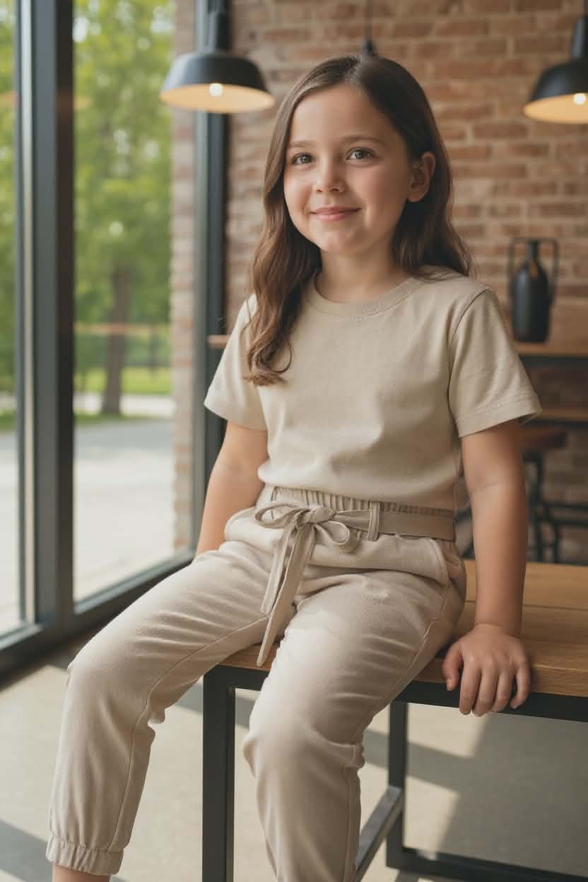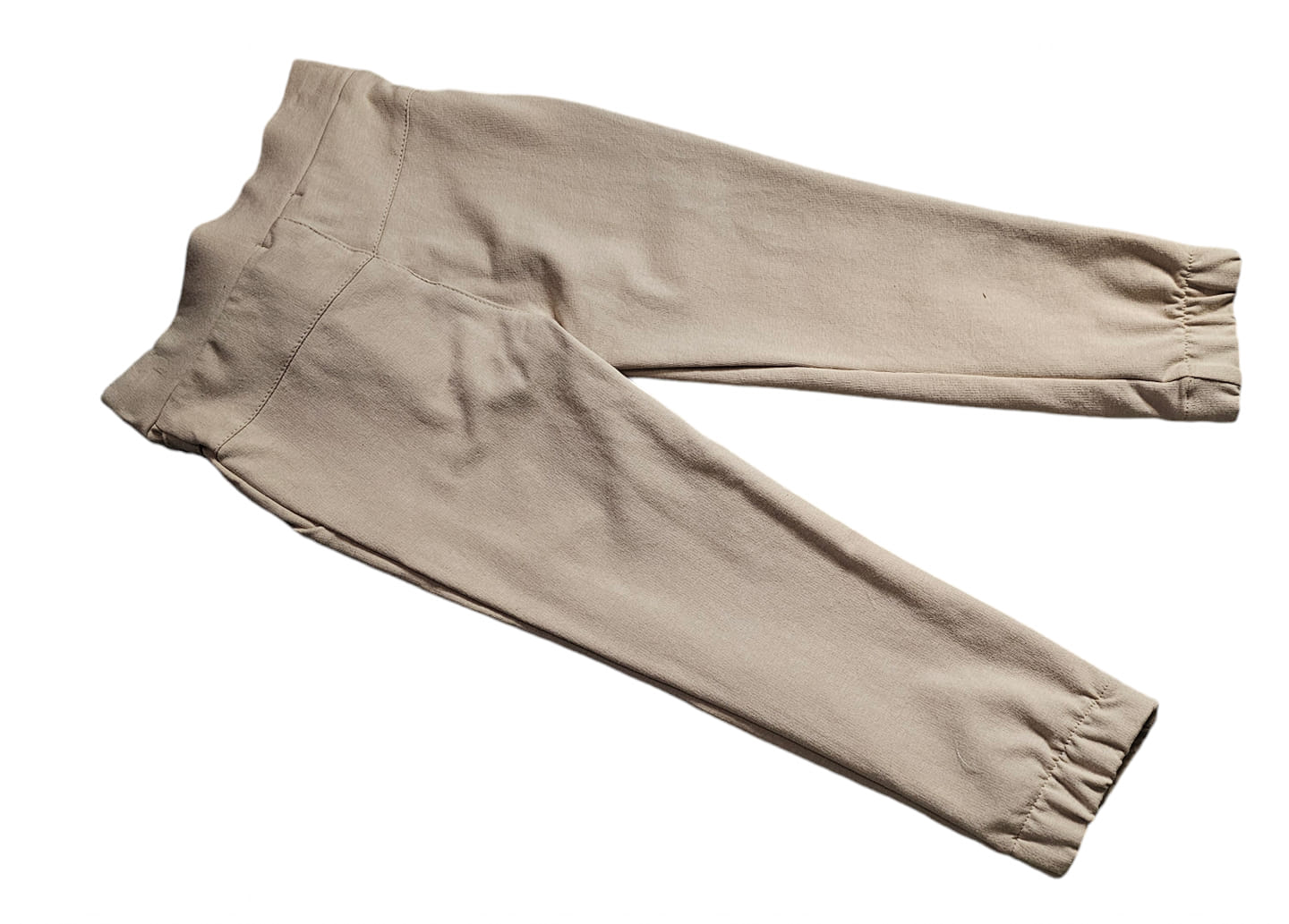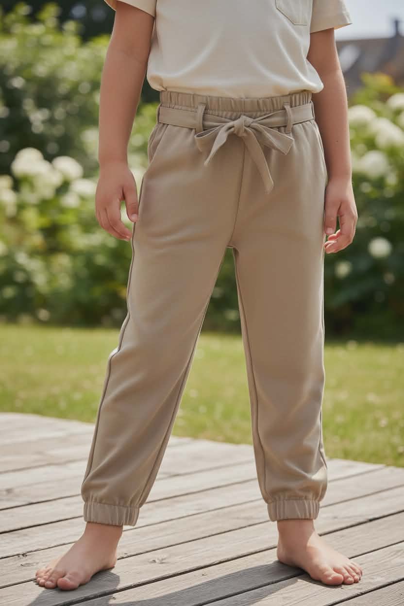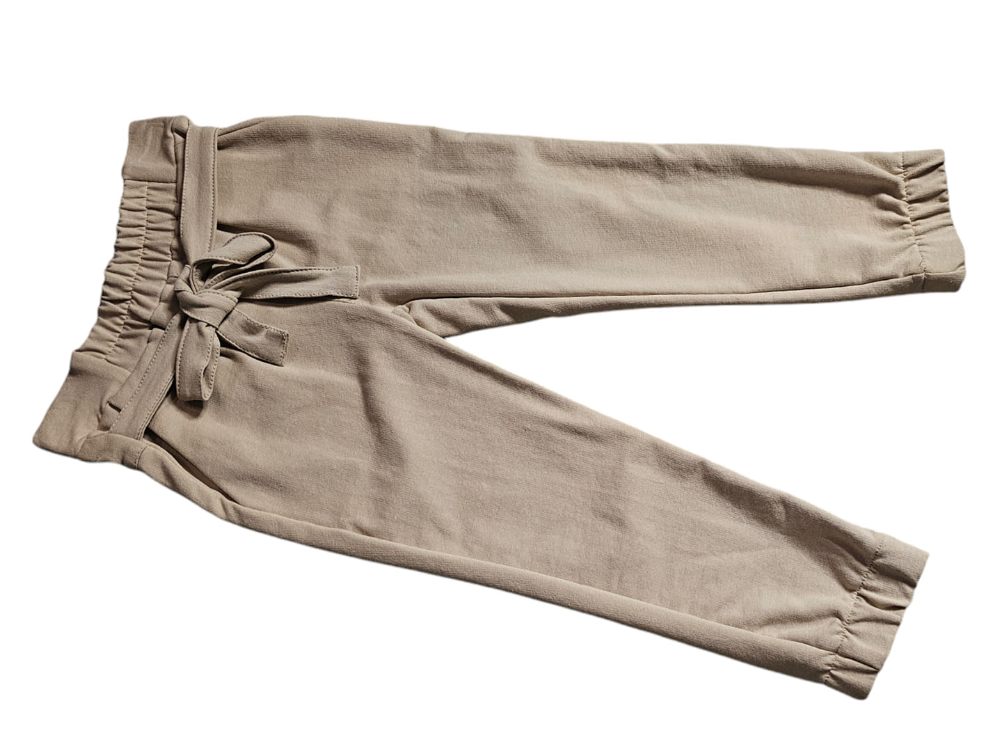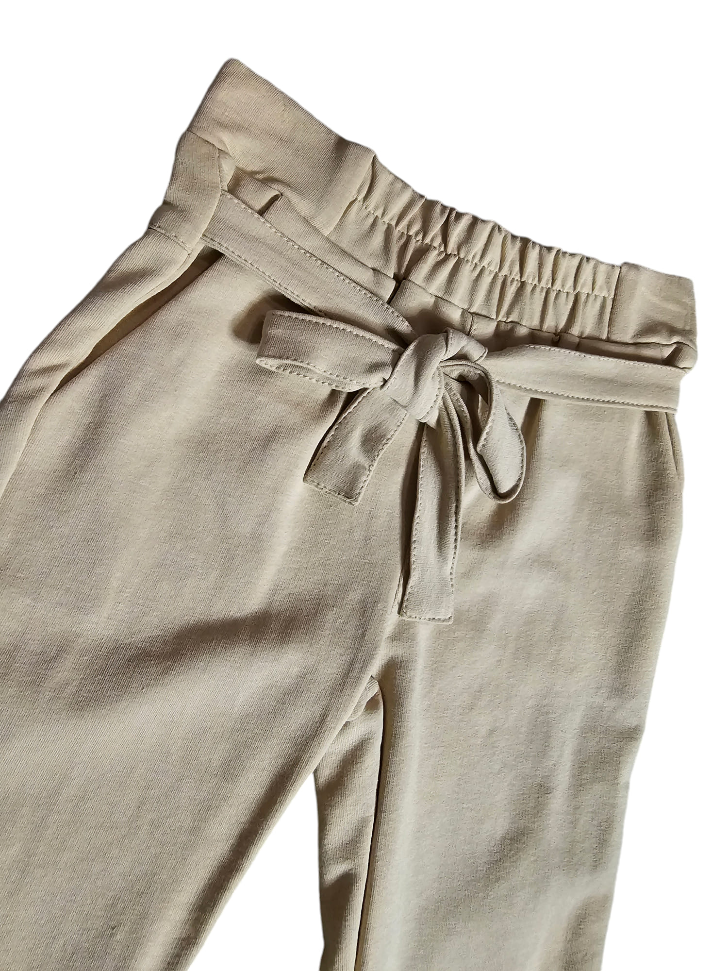 Beżowe spodnie dziewczęce marki Igomill. Wiązanie w pasie. Ściągacze na nogawkach.