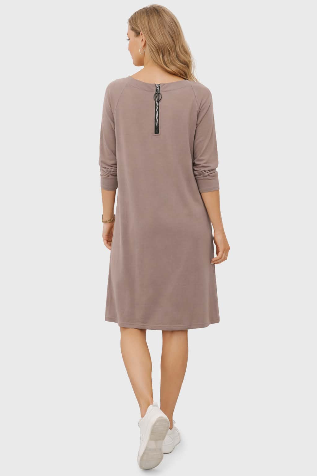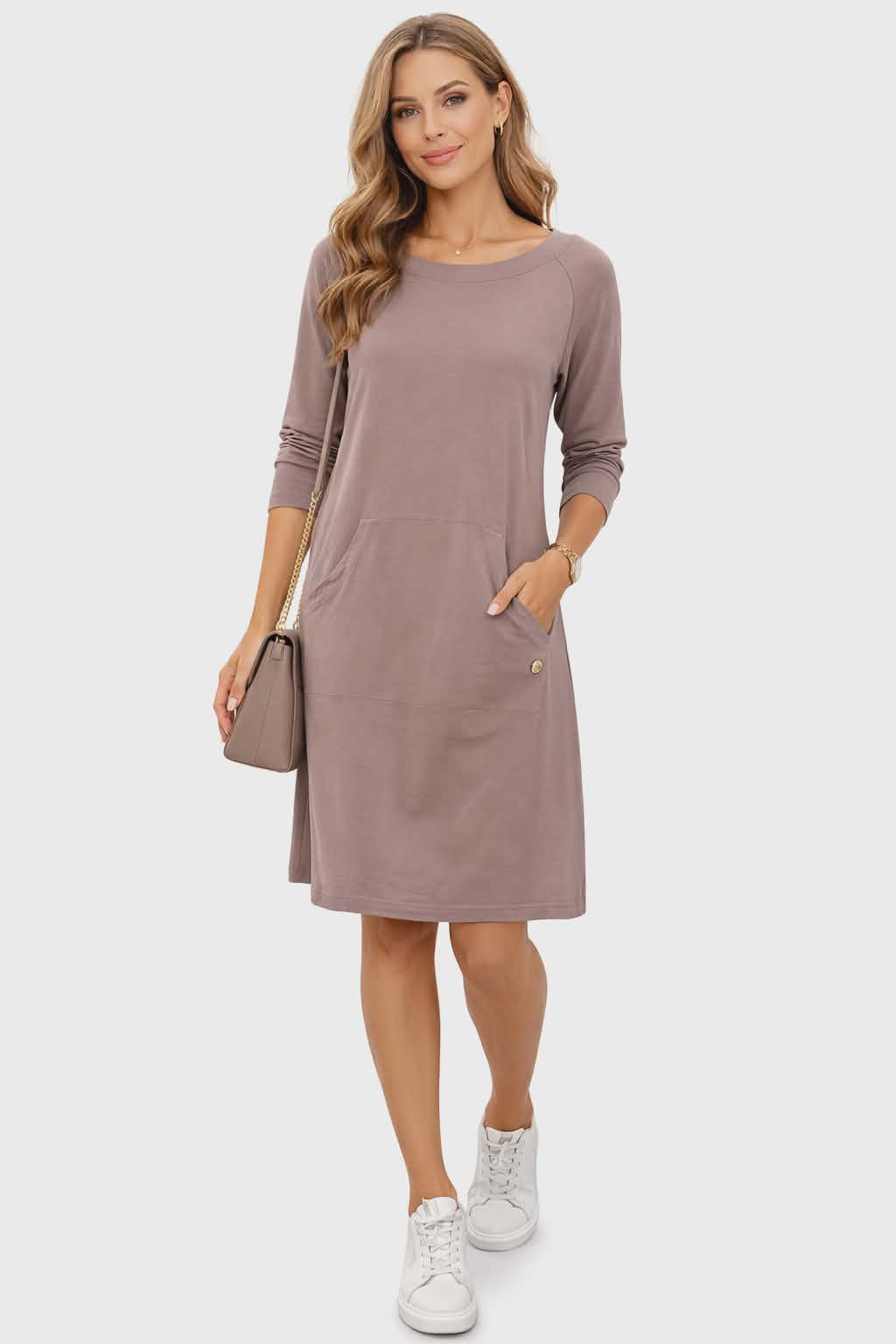Stylowa i niezwykle wygodna sukienka w modnym odcieniu fango (taupe) to idealna propozycja na co dzień. Minimalistyczny fason sprawia, że pasuje do wielu stylizacji – od sportowych po casualowe.