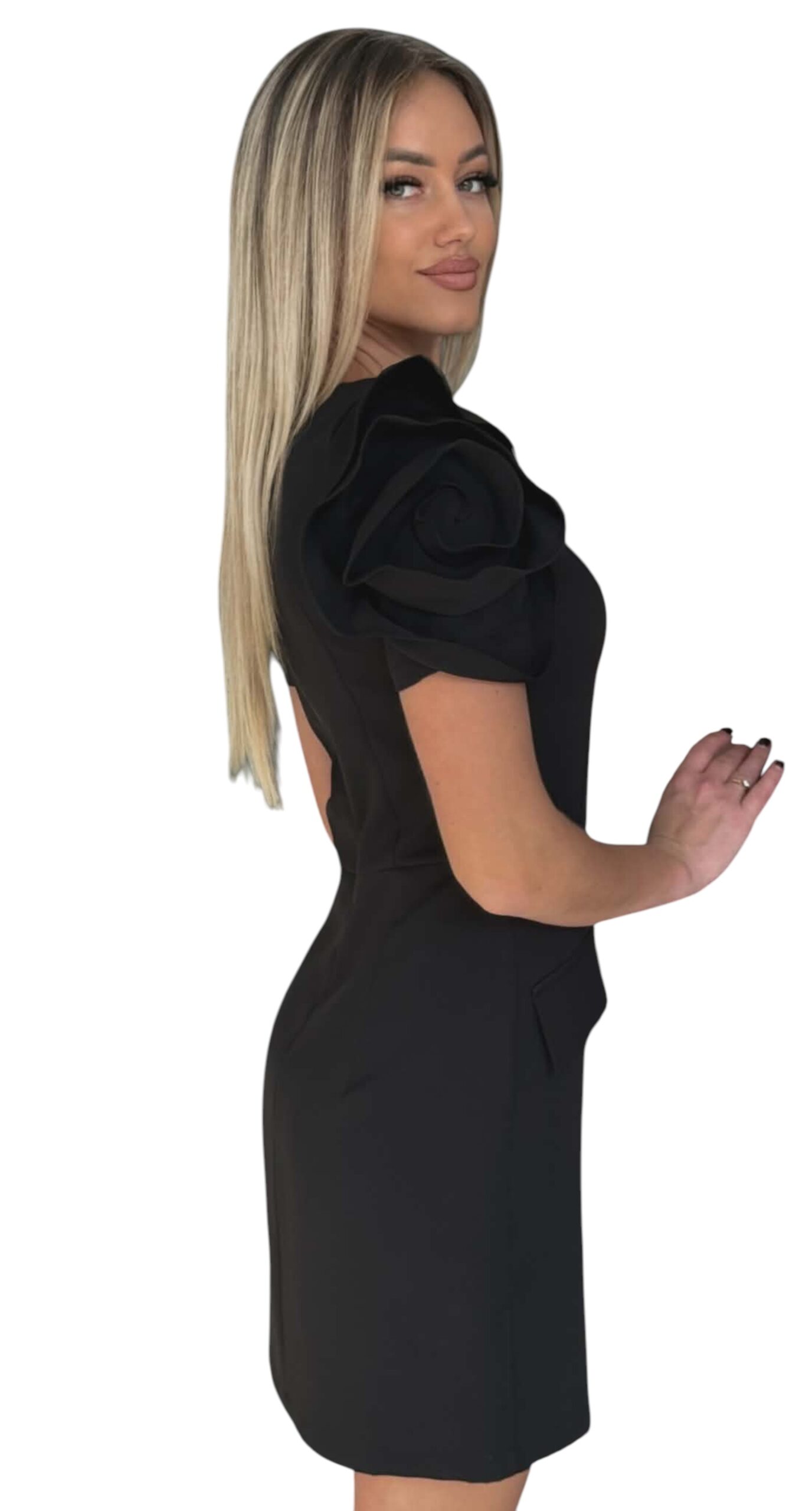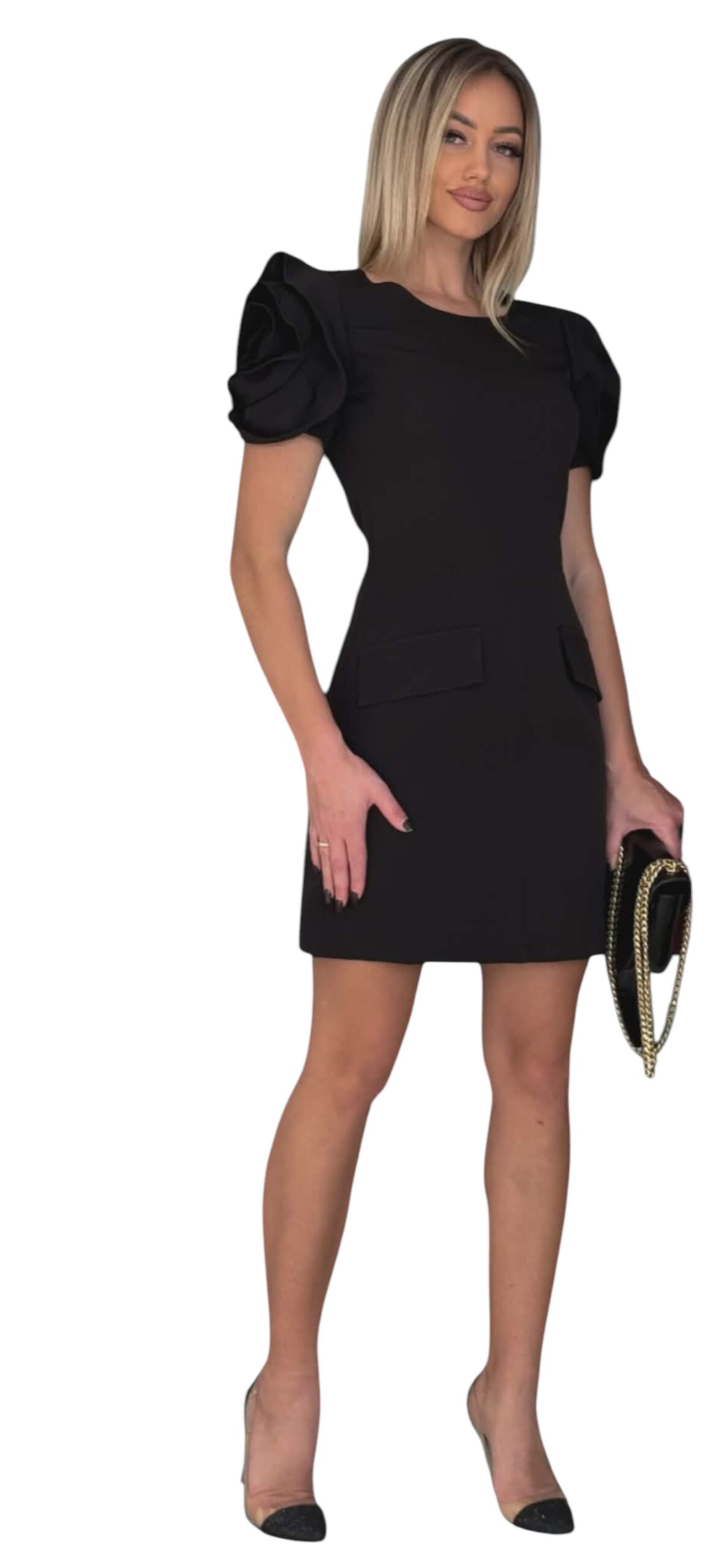 Elegancka sukienka mini z krótkim rękawem ozdobionym kwiatem w kolorze sukienki. Model taliowany, na plecach zapinana na kryty zamek.