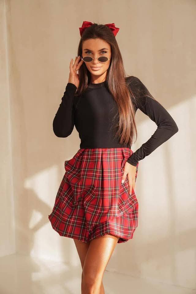 Dół sukienki ma rozkloszowany, lekko podwinięty krój, który dodaje jej lekkości i dziewczęcego charakteru. To idealna propozycja na święta, randkę, zimowe stylizacje lub codzienny look z pazurem.