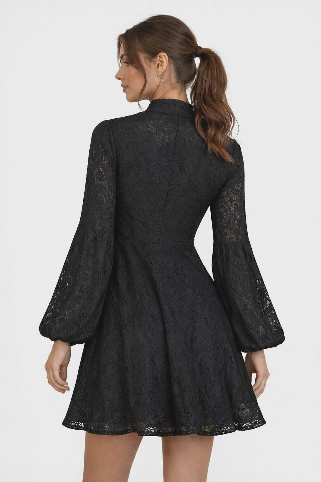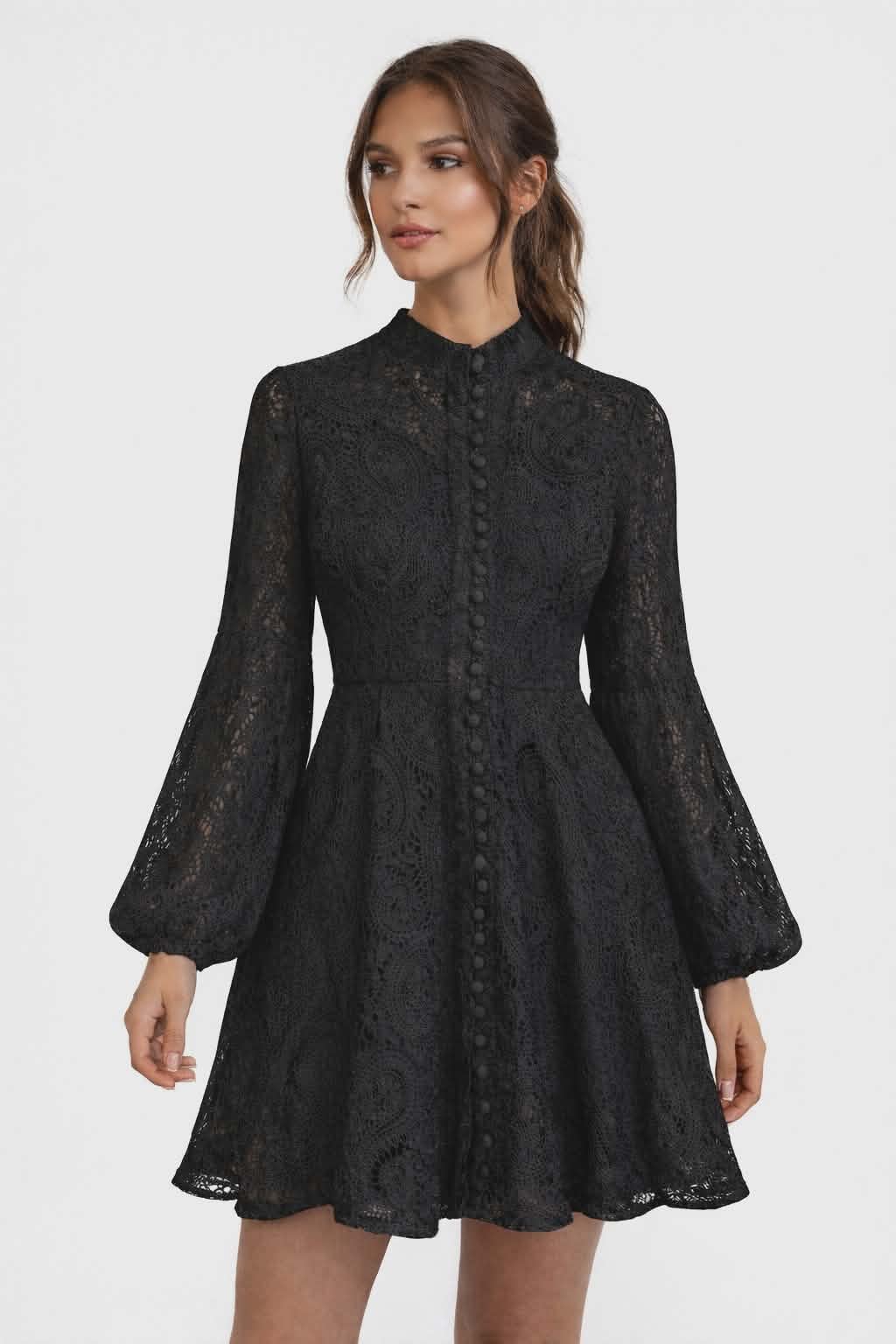 Elegancka i niezwykle kobieca sukienka wykonana z efektownej koronki gipiury. Model pięknie podkreśla sylwetkę – dopasowany w talii i delikatnie rozkloszowany ku dołowi. Sukienka posiada stylowy, zabudowany dekolt oraz ozdobne guziczki na całej długości z przodu, które nadają jej wyjątkowego charakteru. Rękawy są rozszerzane, zakończone gumką, dzięki czemu układają się lekko i wygodnie.