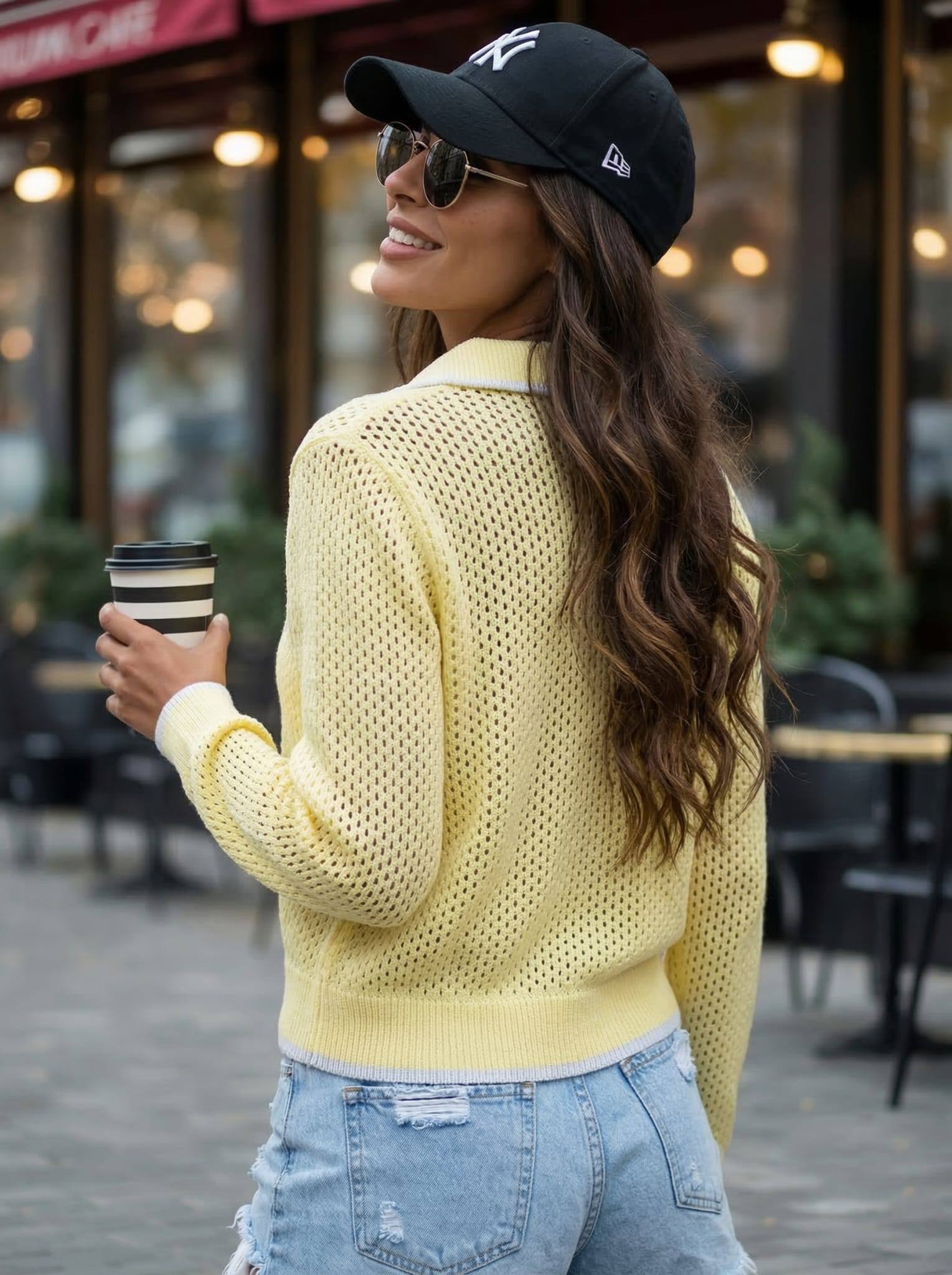 Detale: • zapinany na guziki • subtelny kołnierzyk • ażurowa, oddychająca dzianina • kobiecy, dopasowany fason • dostępny w kilku kolorach (ecru, błękit, żółty, róż)