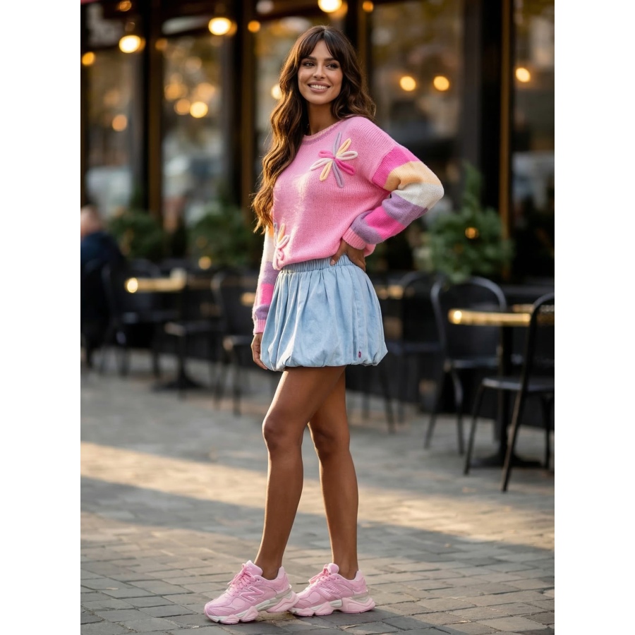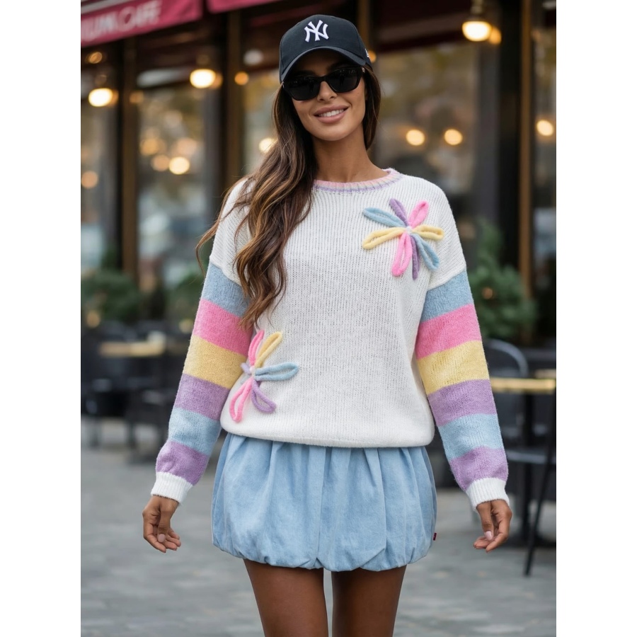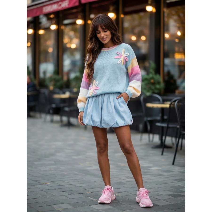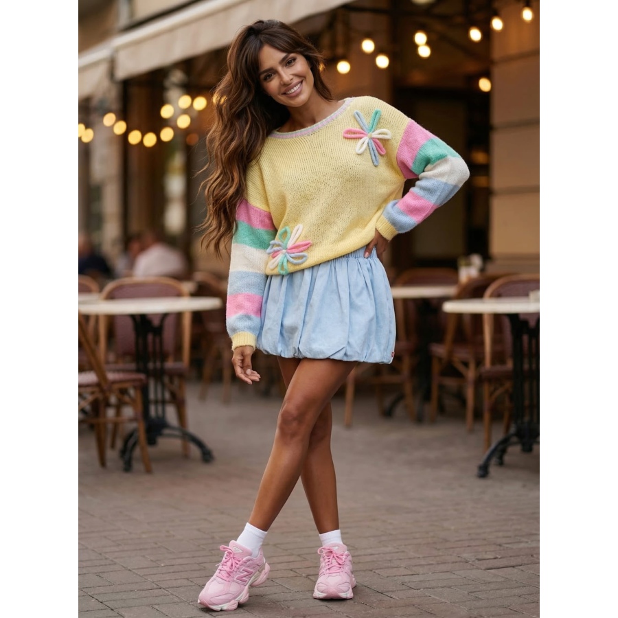 Stylowy i niezwykle kobiecy sweter w modnych, pastelowych kolorach, który przyciąga uwagę oryginalnymi aplikacjami w kształcie kwiatów. To idealna propozycja na co dzień – świetnie sprawdzi się zarówno w casualowych stylizacjach, jak i bardziej dziewczęcych zestawach.