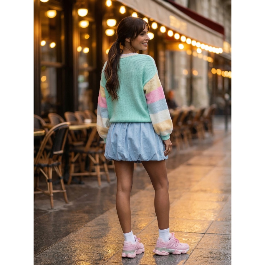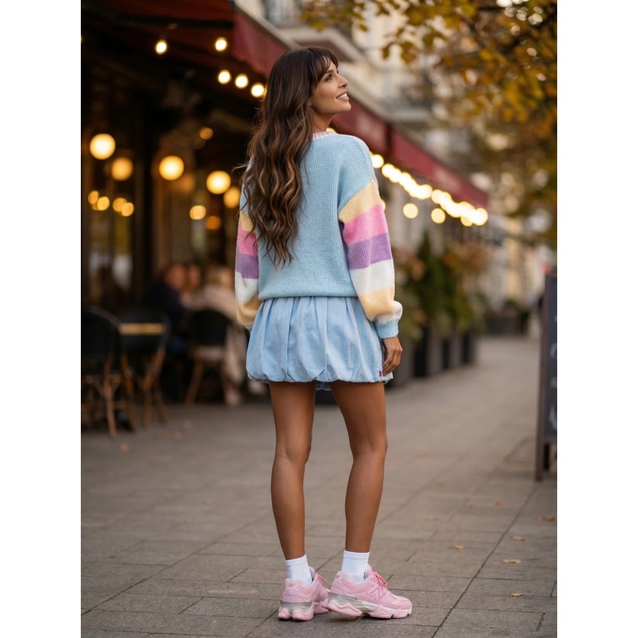 Miękki i przyjemny w dotyku materiał zapewnia komfort noszenia, a luźniejszy fason pasuje do wielu sylwetek. Kolorowe rękawy i subtelne detale dodają mu wyjątkowego charakteru.