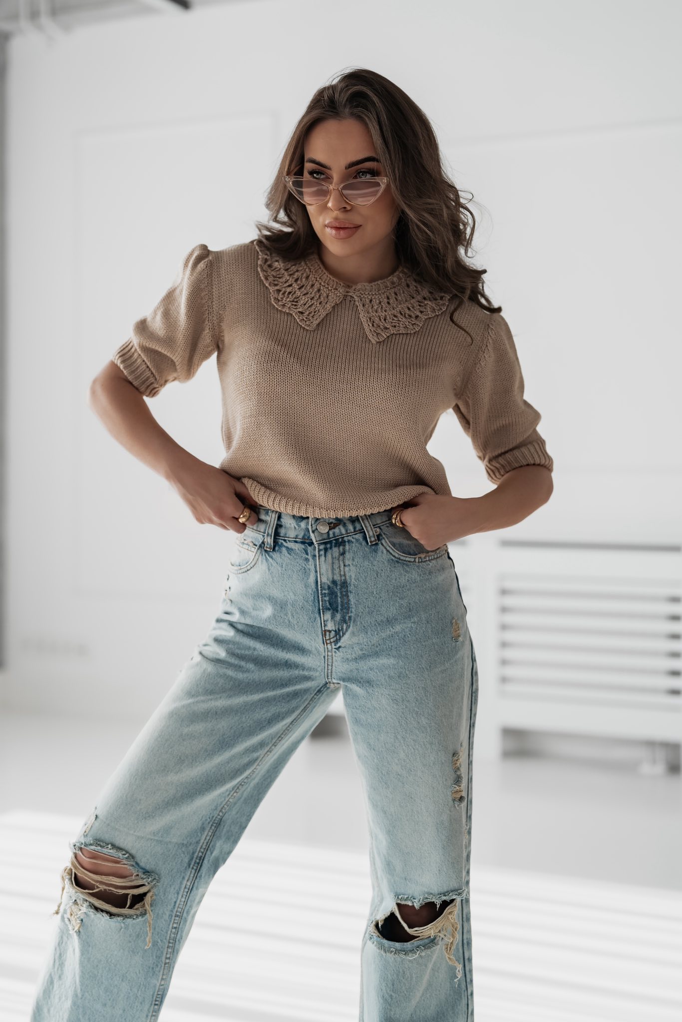 💕 Zachwyca wyjątkowym, ażurowym kołnierzykiem, który dodaje romantycznego charakteru i sprawia, że stylizacja wygląda niezwykle elegancko.