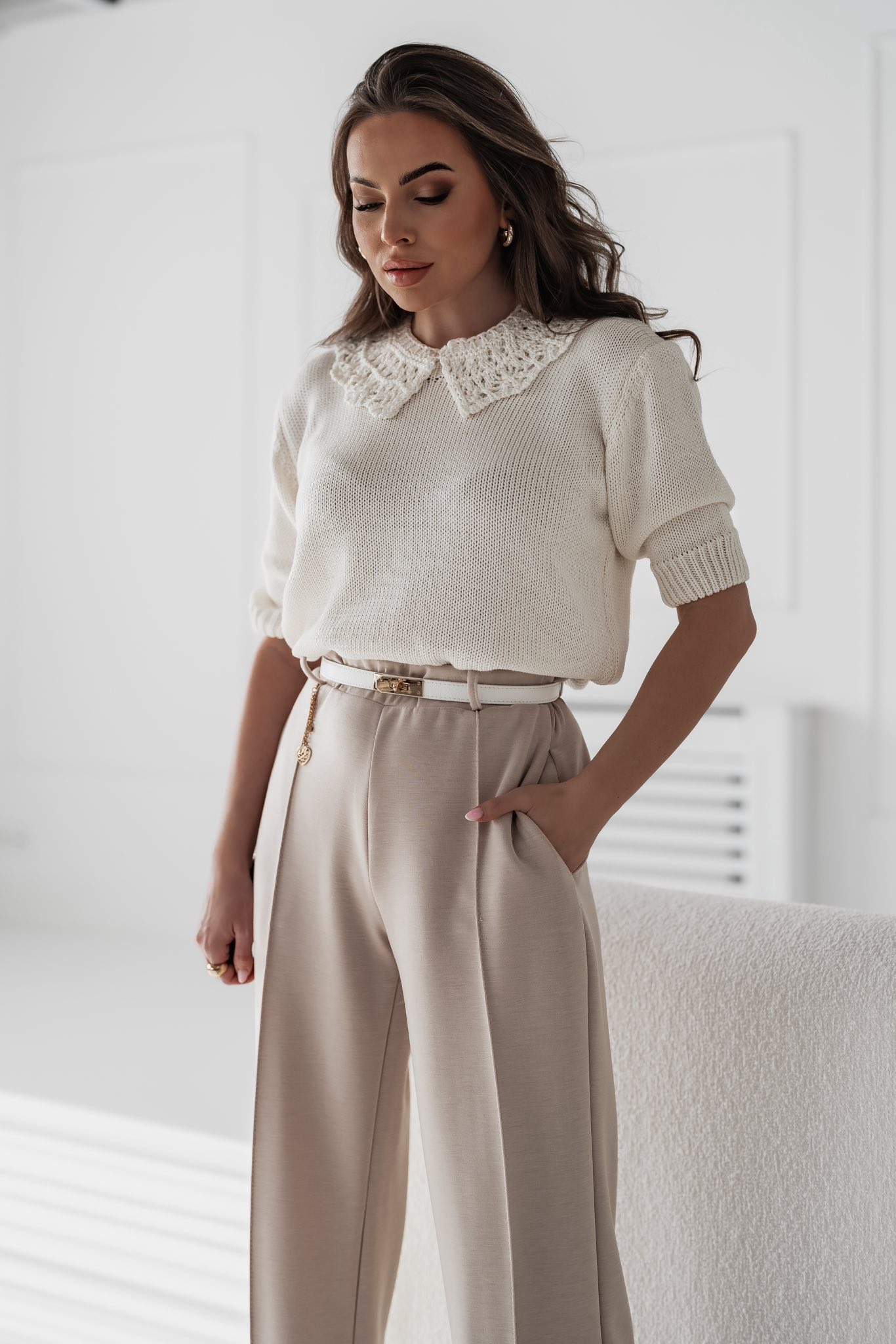 Zachwyca wyjątkowym, ażurowym kołnierzykiem, który dodaje romantycznego charakteru i sprawia, że stylizacja wygląda niezwykle elegancko.