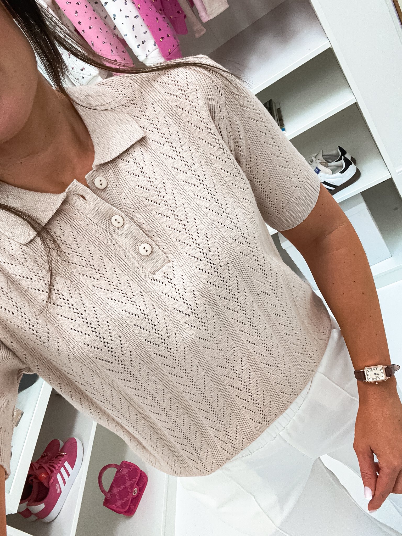 Sweterek polo z super miękkiej, przyjemnej w dotyku przędzy to idealna propozycja na wiosnę i lato 🤍 Delikatny ażurowy wzór nadaje mu lekkości, a klasyczny kołnierzyk z guziczkami dodaje eleganckiego charakteru. Świetnie sprawdzi się zarówno do spodni materiałowych, jak i jeansów czy spódnic.