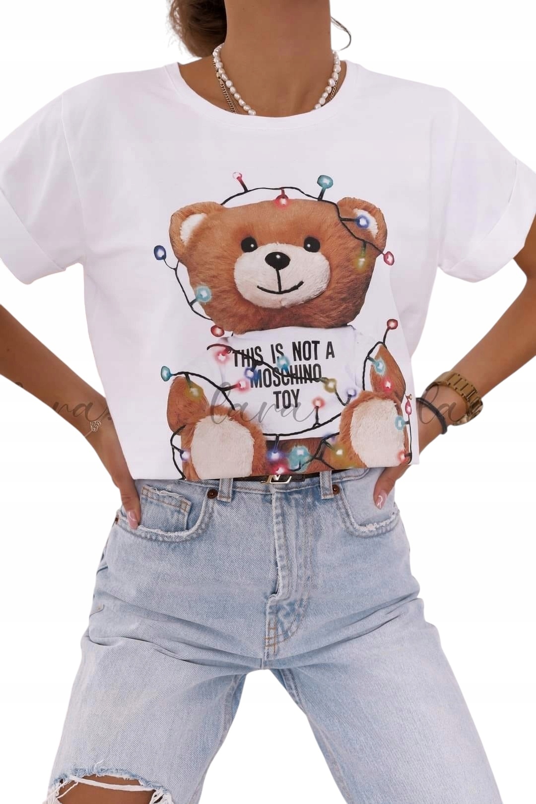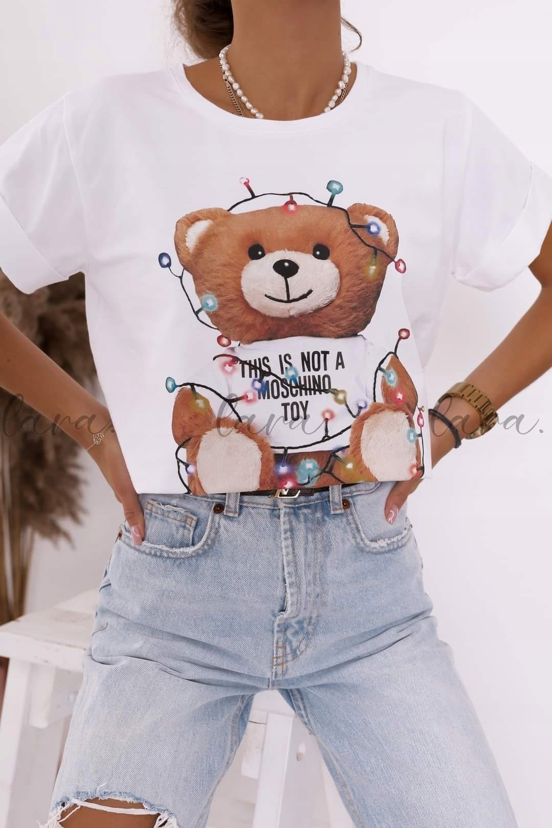 T-shirt damski bluzka świąteczna Lara Fashion Miś biała